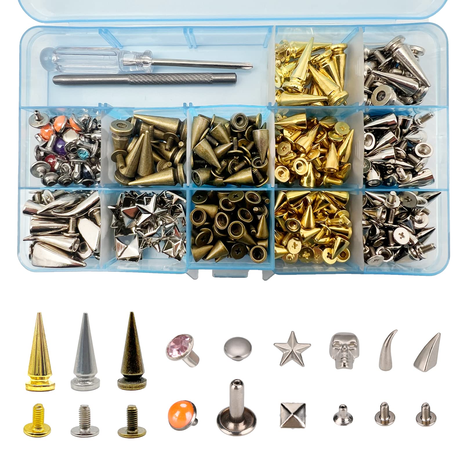 Packing List - Total 244 Sets: 174 sets of spike studs, 10 sets of tubular stud rivets, 10 sets of skull rivets, 10 sets of crystal rivets, 10 sets of color mushroom rivets, 5 sets of dragon claw spikes, 5 sets of cat claw studs and spikes, 10 sets of star rivets, 10 sets of four-jaw square rivets, 1 full set of spike studs installation tool, and a 15-grid transparent storage box. Please refer to the 3rd image in the link for a more detailed packing list.?Easy Storage?All the rivets and setting tools in this product are neatly placed in a 15-grid transparent plastic box, making it easy for you to find the style, size, and color you need, and convenient for storage and carrying. ?Easy to Use?Our Spike Studs are designed to be simple and easy to install. You don't need professional tools, just use the screwdriver and screws we provide to secure them to your clothes. ?Various Styles?We offer a variety of shapes, sizes, and colors of Spike Studs for you to choose from, meeting your different occasions and matching needs, allowing you to easily create a stylish and personalized look. They can also be used to decorate hats, leather shoes, cotton boots, belts, clothes, wallets, pet collars, etc., suitable for all fabrics, with a wide range of uses, and can almost meet all your DIY needs. ?High-Quality Material?Our Spike Studs are made of zinc alloy material, which is shiny and bright in appearance, and not prone to rust. ?Packing List - Total 244 Sets? 174 sets of spike studs, 10 sets of tubular stud rivets, 10 sets of skull rivets, 10 sets of crystal rivets, 10 sets of color mushroom rivets, 5 sets of dragon claw spikes, 5 sets of cat claw studs and spikes, 10 sets of star rivets, 10 sets of four-jaw square rivets, 1 full set of spike studs installation tool, and a 15-grid transparent storage box. Please refer to the 3rd image in the link for a more detailed packing list.Date First Available: February 28, 2023. Country of Origin: China. Manufacturer: Ausarox. Item Weight: 15.5 ounces. Is Discontinued By Manufacturer: No. Best Sellers Rank: #45,652 in Arts, Crafts & Sewing. Customer Reviews: 4.2 4.2 out of 5 stars 10 ratings 4.2 out of 5 stars. : B0BX3SCKPR. Item model number: 244 Sets of Spike Studs. Product Dimensions: 6.8 x 4 x 0.9 inches.