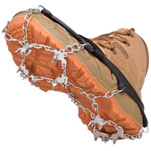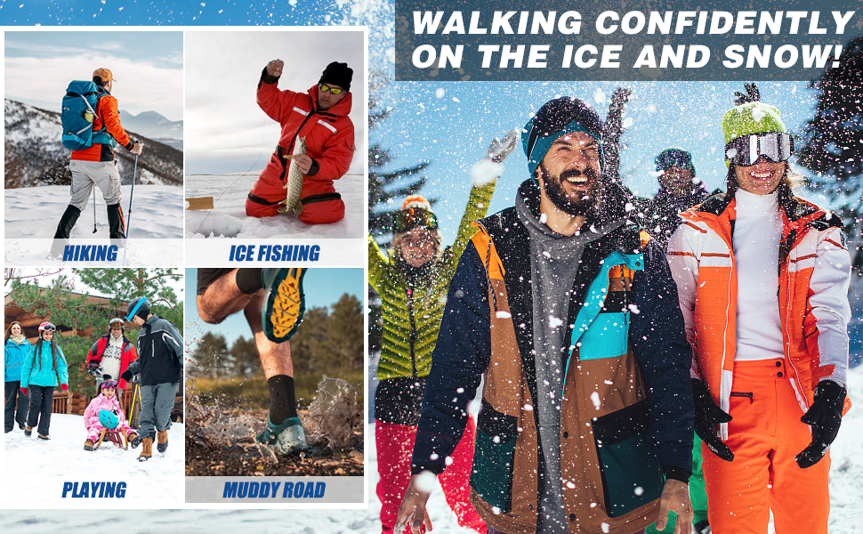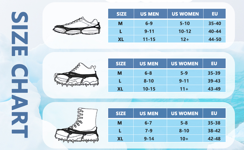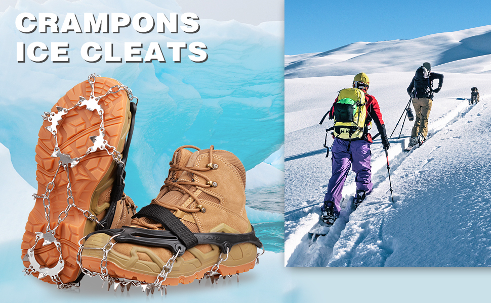 ?Perfect for winter? Available in three sizes for men and women boots, a good winter companion for winter hikes, climbing, jogging, mountaineering, fishing, etc. is used on rocky terrain, ice or snow streets, mud and wet grass.?Easy to carry and wear? Ice shoe gripper work with all types of shoes.You only need three steps, you can put on or take off the crampons in 30 seconds.The included two adjustable straps make the snowshoes safer on their feet.And the crampons can be folded into the attached storage bags, very easy to carry.?Double chain design? Non-slip ice cream traction tunnels consist of an abrasion-resistant double member welding chain and a stronger stainless steel chain.Durable and not easy to break.Reduce accidents during use and extend the lifespan of shoe spikes.?Durable & stretchy? Traction tunnels made of thermoplastic elastomer material, tested to stay flexible at low temperatures and not to tear easy.The stretchy rubber of the hiking iron facilitates covering hiking shoes, winter boots or hiking shoes.?Extreme traction? Campaign ice stollen are equipped with 19 improved stainless steel spikes and a solid chain system.Stronger and safer.The complete sole cover with tunnels on the heel and forefoot offers excellent traction on a variety of ice snow surfaces.You can go, hike or walk confidently on ice and snow.?PERFEKT FÜR WINTER? Erhältlich in drei Größen für Herren- und Damenstiefel, ein guter Winterbegleiter für Winterwanderungen, Klettern, Joggen, Bergsteigen, Angeln usw. Wird auf felsigem Gelände, Eis- oder Schneestraßen, Schlamm und nassem Gras verwendet. ?EINFACH ZU TRAGEN UND ZU TRAGEN? Eisschuhgreifer funktionieren mit allen Arten von Schuhen. Sie brauchen nur drei Schritte, Sie können die Steigeisen in 30 Sekunden an- oder ausziehen. Die mitgelieferten zwei verstellbaren Riemen machen die Schneeschuhe sicherer an Ihren Füßen. Und die Steigeisen können in die angebrachte Aufbewahrungstasche gefaltet werden, sehr einfach zu tragen. ?DOPPELKETTENDESIGN? Rutschfeste Eis-Traktionsstollen bestehen aus einer abriebfesten Doppelglied-Schweißkette und einer stärkeren Edelstahlkette. Langlebig und nicht leicht zu brechen. Reduzieren Sie Unfälle während des Gebrauchs und verlängern Sie die Lebensdauer von Schuhspikes. ?LANGLEBIG & Dehnbar?Traktionsstollen aus thermoplastischem Elastomermaterial, getestet, um bei niedrigen Temperaturen flexibel zu bleiben und nicht leicht zu reißen. Das dehnbare Gummi der Wandersteigeisen erleichtert das Überziehen über Wanderschuhe, Winterstiefel oder Wanderschuhe. ?EXTREME TRAKTION? Steigeisen Eisstollen sind mit 19 verbesserten Edelstahlspikes und einem festen Kettensystem ausgestattet. Stärker und sicherer. Die vollständige Sohlenabdeckung mit Stollen an Ferse und Vorderfuß bietet hervorragende Traktion auf einer Vielzahl von Eisschneeoberflächen. Sie können gehen, wandern oder selbstbewusst auf Eis und Schnee laufen.Spikes für Schuhe Schuhspikes 19 Zähne Grödel Steigeisen für Bergschuhe Schuhkrallen Eisspikes Ice Klampen Schuhketten Eiskrallen für Wandern Running Trail Trekking Winter Outdoor