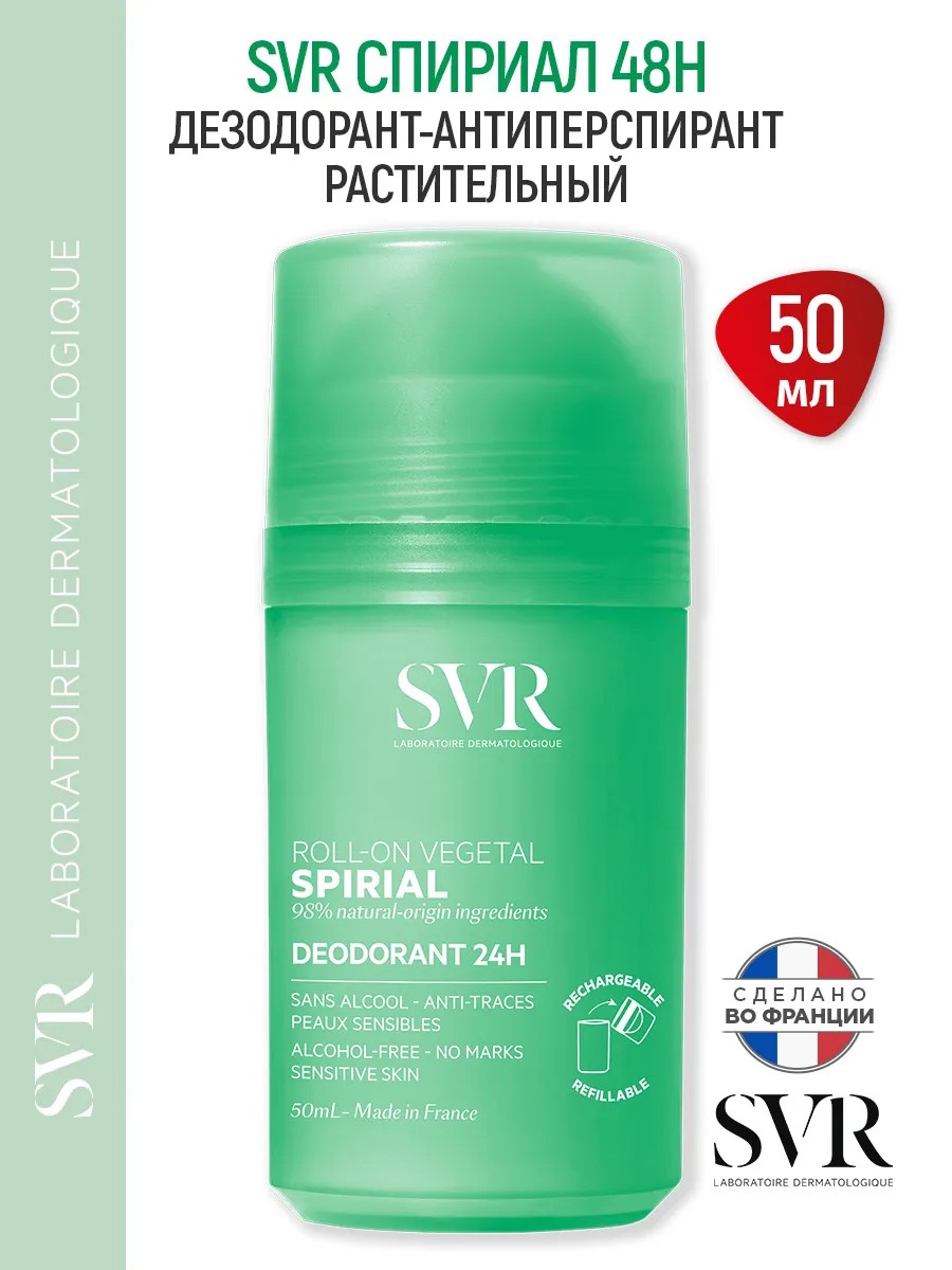 Натуральный шариковый Дезодорант Растительный СВР Спириал (SVR Spirial 24h Deodorant Plant Roll-On), 50 мл. SVR Спириал дезодорант-антиперспирант растительный - средство при нормальном потоотделении в зоне подмышечных впадин с высокой эффективностью 24 часа.