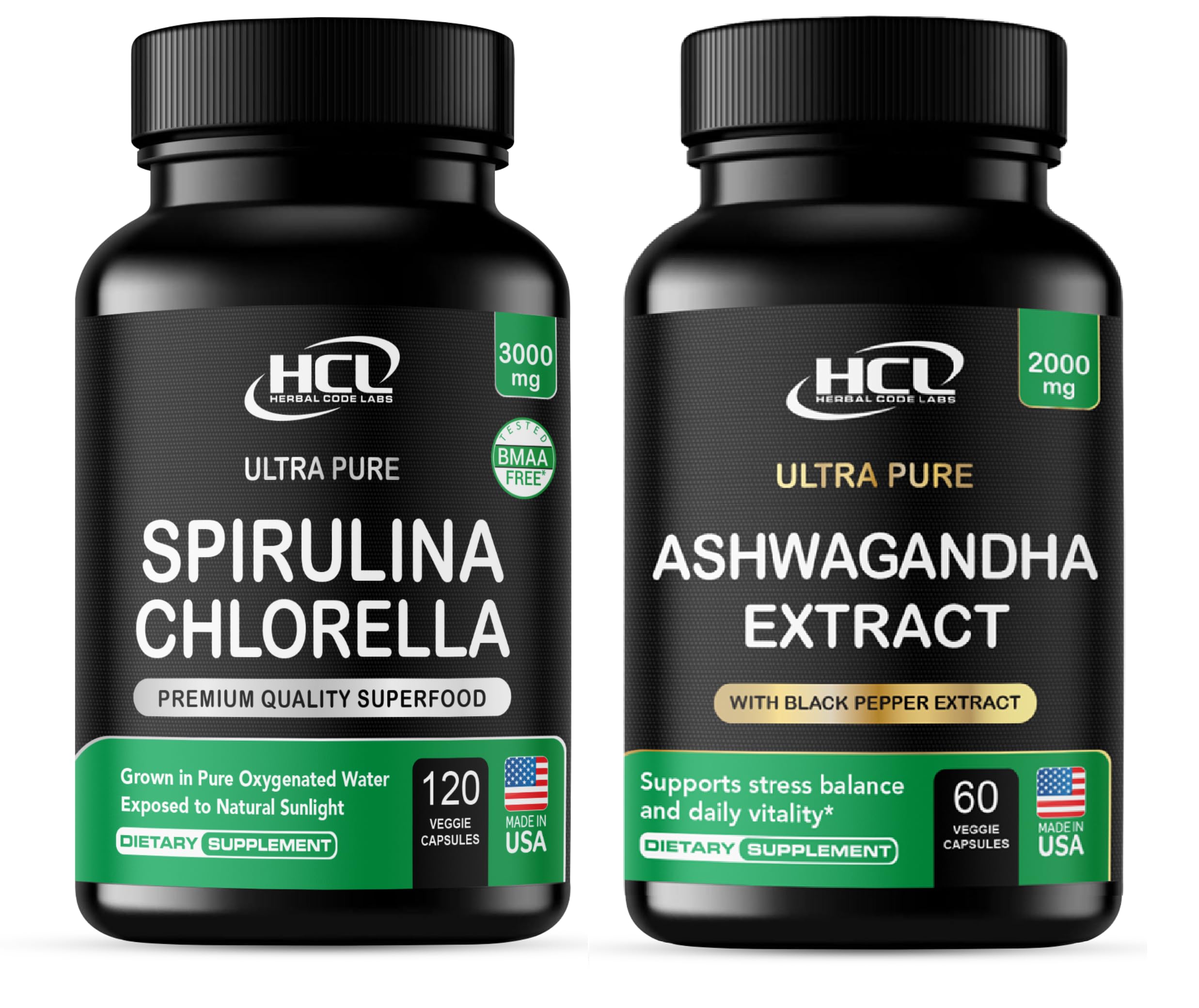 This powerful bundle combines two premium supplements to support your wellness routine naturally. Each serving of Herbal Code Labs Spirulina Chlorella capsules delivers 3000 mg of nutrient-dense blue-green algae, rich in vegan protein, vitamins, minerals, and chlorophyll. It's a natural green superfood blend for daily detox and vitality. Paired with HCL Ashwagandha capsules (2000 mg per serving), this adaptogenic herb is traditionally used to help the body manage stress. Enhanced with Lemon Balm and Black Pepper Extract for better absorption and mood support, this combination is designed to help you feel energized and balanced. All ingredients are plant-based, made in the USA, and third-party tested for purity. No fillers, preservatives, or GMOs, just natural support in easy-to-swallow vegetarian capsules.NUTRIENT-DENSE SUPERFOODS IN EVERY SERVING – Spirulina and chlorella help energize from within, support digestion, and provide complete vegan nutrition. Ashwagandha and lemon balm work to support overall well-being and balance. ALL NATURAL, VEGAN, NON-GMO MADE IN USA – No fillers, binders, or preservatives. Our capsules are gluten-free, soy-free, dairy-free, and third-party tested for purity in FDA-registered, GMP-compliant facilities. HIGH ABSORPTION EFFECTIVENESS – Our Ashwagandha capsules are combined with black pepper extract to boost absorption, while spirulina chlorella delivers 3000 mg per serving of protein, vitamins, minerals, and antioxidants. NATURAL DETOX STRESS MANAGEMENT FORMULA – Spirulina and chlorella are rich in chlorophyll for natural detox support. Ashwagandha is an Ayurvedic herb that may help promote a calm and balanced mood. PUREST SPIRULINA CHLORELLA POTENT ASHWAGANDHA – We procure pure, non-irradiated spirulina chlorella from clean, safe waters and use high-quality ashwagandha root extract (2000 mg per serving) with lemon balm for enhanced effectiveness.