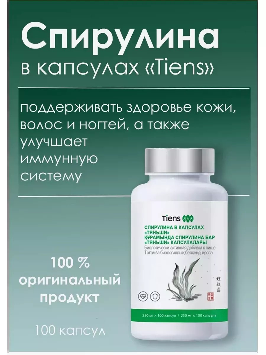 Tiens Spirulina is a dietary supplement containing a high concentration of trace elements, vitamins, and antioxidants. It is produced from spirulina, a blue algae microalgae that is one of the most ancient organisms on Earth. Spirulina has a light green color and a characteristic algae smell. It contains proteins, fats, carbohydrates, vitamins B, C, D, E, and K, as well as iron, calcium, magnesium, phosphorus, zinc, selenium, and other beneficial elements. Tiens Spirulina has a number of beneficial properties: Strengthens the immune system: Thanks to the vitamins and minerals, spirulina increases the body's resistance to infections and viruses. Normalizes metabolism: Spirulina improves digestive function and helps maintain optimal cholesterol levels. Improves skin and hair: The antioxidants in spirulina help protect skin cells from the harmful effects of free radicals and prevent premature aging. Boosts energy levels: Rich in protein and vitamins, spirulina is a beneficial product for those with an active lifestyle or those suffering from chronic fatigue. TianShi Spirulina is available in capsule form. It is recommended to take spirulina according to the package instructions or as recommended by a doctor or nutritionist.