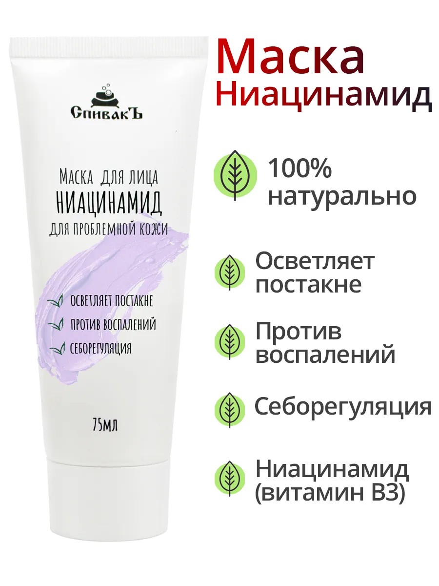 Маска для лица Ниацинамид- секрет здоровой и сияющей кожи! Ниацинамид - витамин B3 - имеет клинически доказанную эффективность: препятствует появлению высыпаний, осветляет постакне и пигментные пятна, уменьшает воспаления, нормализует работу сальных желез, сужает поры и обладает антиоксидантными свойствами. Регулярное применение маски способствует уменьшению мелких морщин, повышает тургор кожи, восстанавливает гидролипидный барьер. Ниацинамид стимулирует синтез керамидов, они действуют как "кирпичики" в липидном слое кожи, обеспечивая его целостность и способность удерживать влагу. Увеличение количества керамидов повышает увлажненность кожи и улучшает её текстуру. Ниацинамид способствует выработке филаггрина, белка, который "склеивает" клетки рогового слоя, тем самым создавая надежный защитный барьер кожи. Маска содержит эфирные масла лайма и каяпута, они обладают выраженными противовоспалительными и свойствами, повышают упругость и эластичность кожи. Применение: Нанесите маску тонким слоем на чистую кожу лица и шеи, оставьте на 10-15 мин, затем смойте теплой водой. Использовать 1-2 раза в неделю. Для достижения максимального эффекта сочетайте эту маску с сывороткой ниацинамид и кремами для лица СпивакЪ. Какие-либо средства с кислотами допустимо использовать в тот же день, но только в другое время суток.