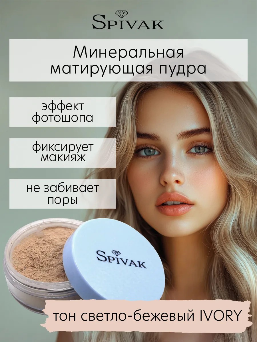 MINERAL MATTE LOOSE POWDER Ivory (Matifying mineral face powder, ivory tone) creates a flawless matte skin tone! This loose powder has an incredibly light, silky texture. It evens out skin texture, conceals imperfections, and sets makeup. Spivak powder is made with ultra-finely ground mineral pigments and glides on like a weightless veil, providing perfect facial contouring. This mattifying face powder won't clog pores, protects against harmful UV rays, and prevents shine. It does not contain mineral oils, silicones, preservatives, alcohol, synthetic dyes, or fragrances. Suitable for all skin types, including sensitive skin. The Ivory shade is for fair skin with a beige undertone. Spivak mineral makeup is organic decorative cosmetics. Our products are not tested on animals and are suitable for vegetarians and vegans.