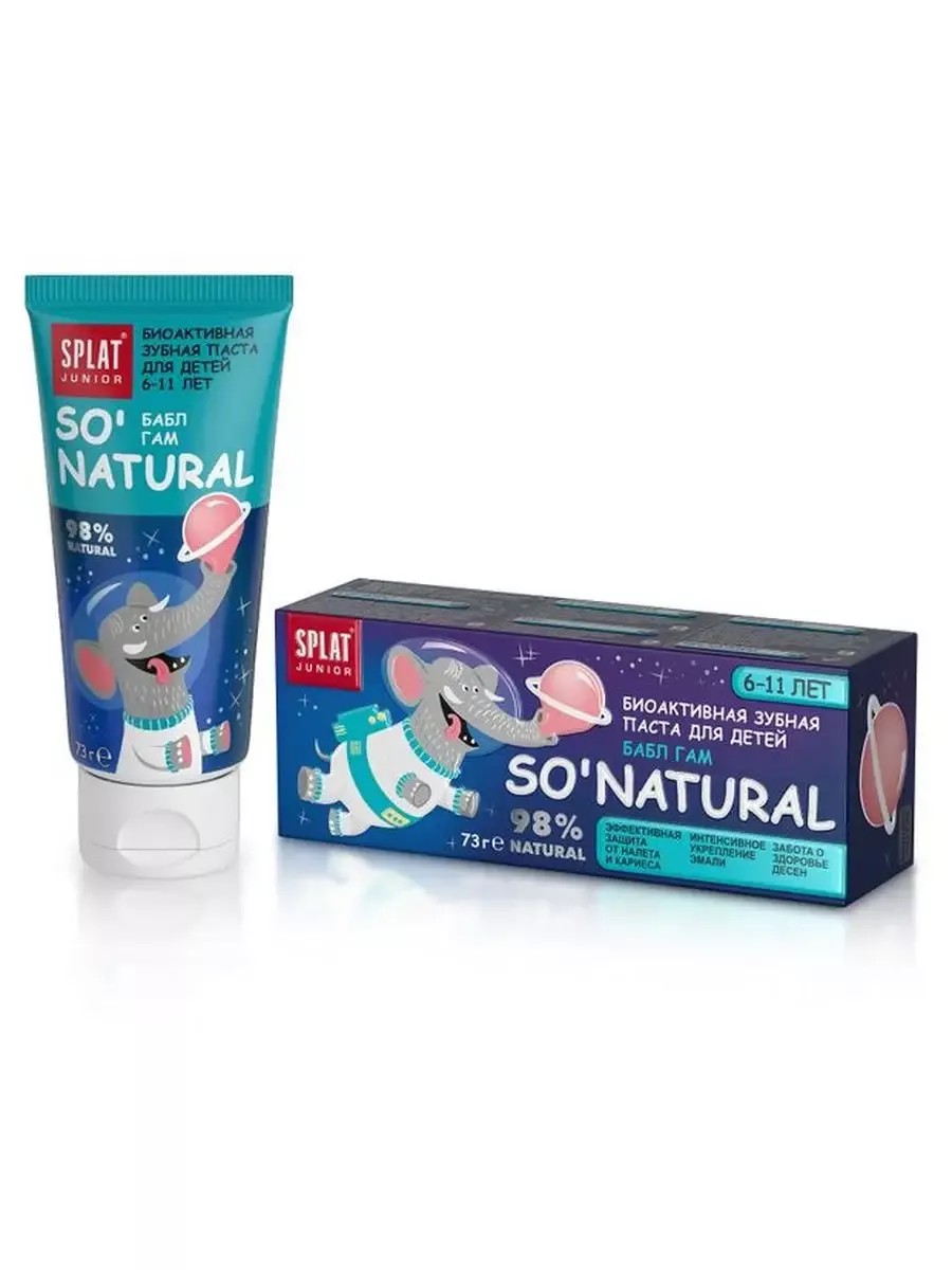 Splat, Зубная паста детская Junior бабл Гам биоактивная, 73 г. Натуральная безопасная детская зубная паста Splat для эффективной защиты от кариеса, интенсивного укрепления эмали и заботы о здоровье десен. Уникальной запатентованная система Luctatol на основе экстракта японского лакричника до 96% сокращает образование зубного налета и уничтожает кариесогенные бактерии, способствуя защите от кариеса.