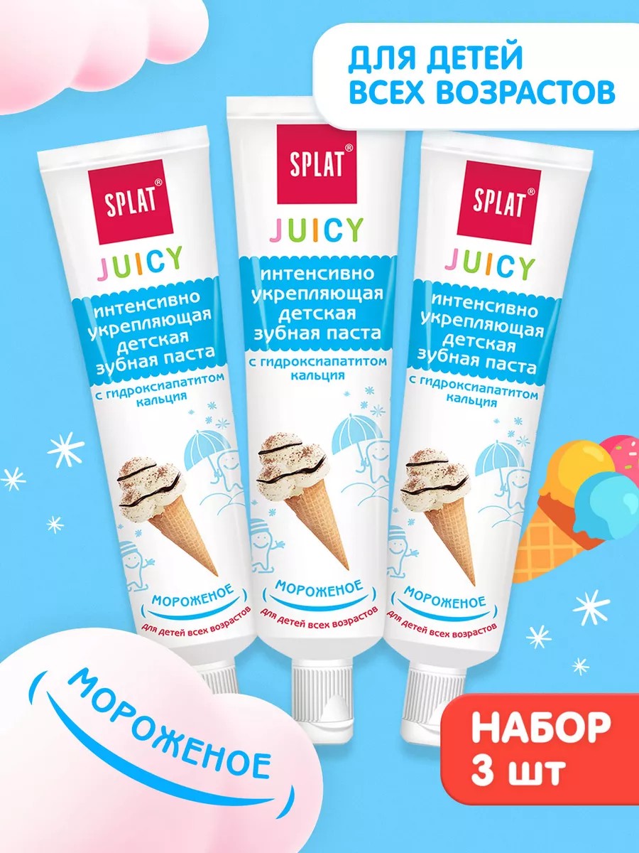 SPLAT Juicy Natural Strengthening Fluoride-Free Children's Toothpaste with ICE CREAM Flavor, 35 ml, 3 pcs. SPLAT JUICY "ICE CREAM" intensively strengthening children's toothpaste with calcium hydroxyapatite is ideal for fragile children's enamel and is designed for dental care for children of all ages, including babies and toddlers. Calcium hydroxyapatite (mHAP) in nanoform penetrates deep into enamel, strengthening it, sealing damage like a filling, restoring the surface's natural smoothness and resistance to bacteria and acids. The natural, patented Luctatol system effectively inhibits the formation of soft plaque and specifically destroys cariogenic Streptococcus mutans bacteria. Aloe Vera gel has moisturizing and anti-inflammatory properties, soothes and heals gums. The SPLAT Juicy toothpaste set deeply restores and strengthens hard dental tissue, effectively protects against cavities and plaque, and provides comprehensive oral care. This toothpaste DOES NOT CONTAIN fluoride, harsh abrasives, antiseptics, alcohol, synthetic solvents, PEG, SLS, or other synthetic foaming ingredients.