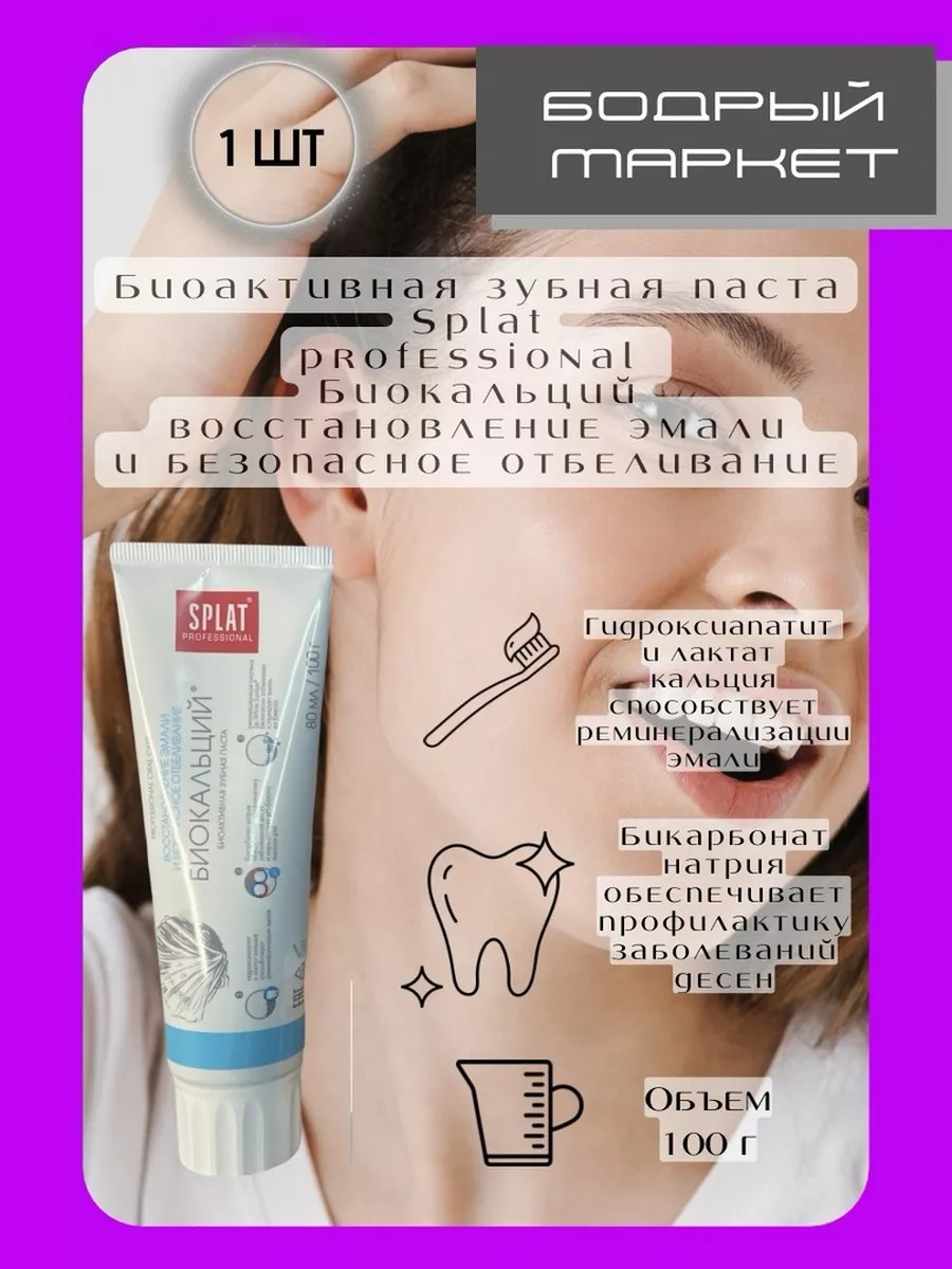 Представляем вам инновационную зубную пасту БИОКАЛЬЦИЙ от Splat Professional, которая обеспечит безопасное отбеливание и восстановление эмали ваших зубов.
