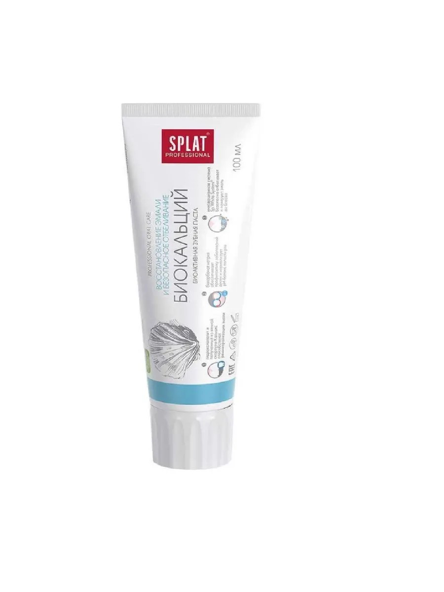 Splat Professional, Зубная паста Биокальций, 100 мл. Представляет собой передовое средство для ухода за зубами, специально разработанное для укрепления эмали и повышения комфорта. Она содержит биоактивный элемент Кальцис, извлекаемый из яичной скорлупы, и гидроксиапатит — ключевое вещество, обеспечивающее прочность тканей зубов. Уникальная комбинация кальция и гидроксиапатита способствует заполнению микропор и микротрещин, возвращая зубам естественное сияние и прочность. Насыщение природными минералами снижает дискомфорт от влияния внешних факторов, таких как горячие и холодные напитки. На начальных стадиях кариеса паста эффективно образует защитный барьер, предотвращая дальнейшее разрушение зубных тканей. Природные ферменты эффективно расщепляют налет, поддерживая здоровье и свежесть полости рта на длительное время. Бережно полирует и осветляет зубы, обеспечивая заметный эстетический эффект без вреда для эмали.
