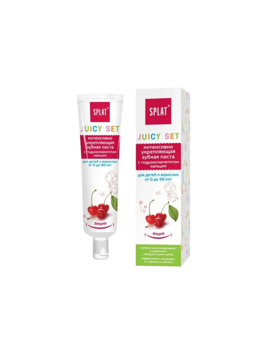 Пасты SPLAT Juicy глубоко восстанавливают и укрепляют твердые ткани зубов, эффективно защищают от кариеса и налета.