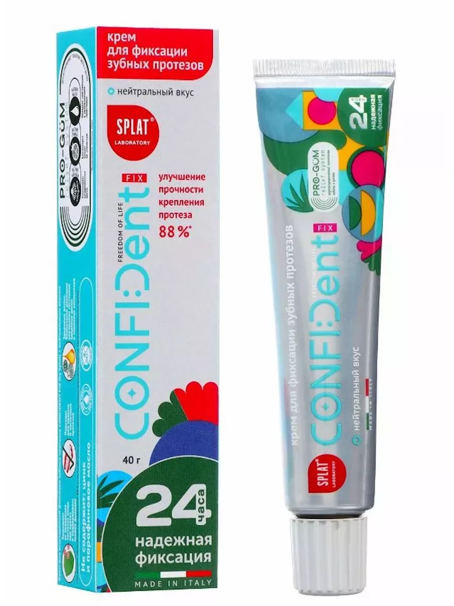 Splat Confident Fix Denture Cream, Neutral Flavor, 40g. Confident Fix denture fixation cream was developed by the Splat Innovation Laboratory in collaboration with the Italian company BetaPharm. This isn't just a denture fixation cream—it cares for your gums, your comfort, and a radiant smile! Confident Fix is based on the registered Pro-Gum Relief System technology, an international patent application pending, and the result of three years of research by scientists from around the world. This technology provides the cream with a reliable seal, reduces denture friction, and protects the gums and palate at pressure points.