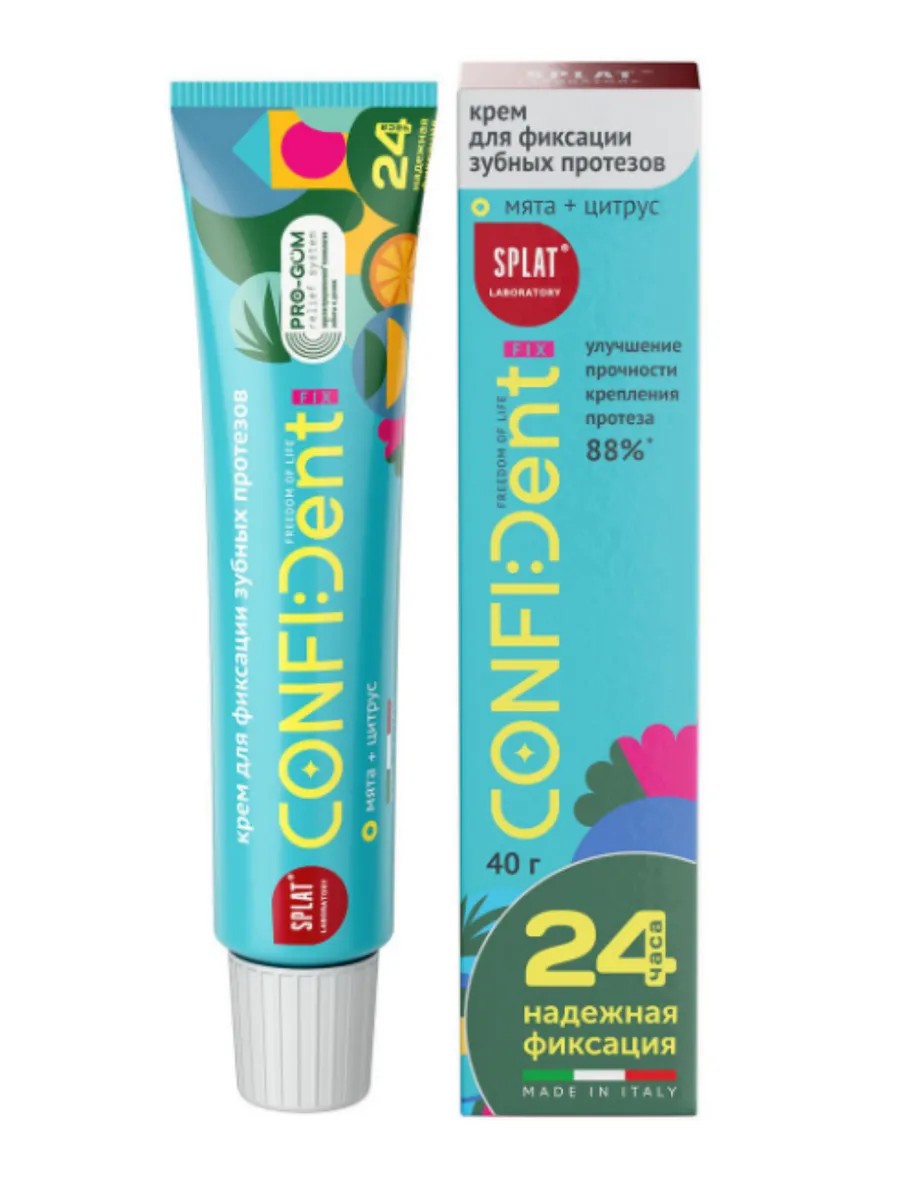 Крем для фиксации зубных протезов CONFIDent Fix разработан Инновационной Лабораторией SPLAT совместно с итальянской компанией BetaPharm. Это не просто крем для сильной фиксации протезов — это забота о дёснах, ваш комфорт и лучезарная улыбка! CONFIDent Fix основан на зарегистрированной технологии PRO-GUM Relief System (международная патентная заявка) - результат трехлетнего труда ученых из разных стран. Технология обеспечивает крему надежную герметичность, уменьшает трение протезов, защищает десны и нёбо в точках давления.