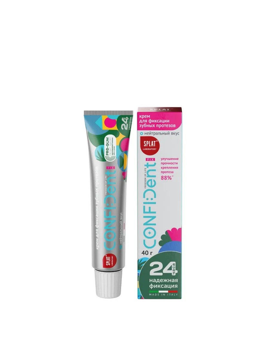 Splat Denture Fixing Cream, Flavored Tube, 40g. CONFIDent Fix denture fixing cream was developed by the SPLAT Innovation Laboratory in collaboration with the Italian company BetaPharm.