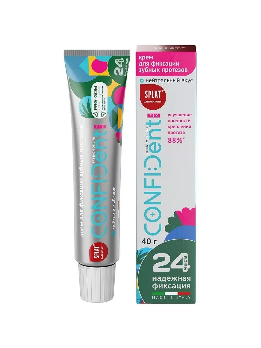 SPLAT CONFIDENT FIX CREAM FOR COMPREHENSIVE FIXATION OF DENTURES 40.0/NEUTRAL TASTE. CONFIDent Fix denture fixation cream was developed by the SPLAT Innovation Laboratory in collaboration with the Italian company BetaPharm. This is more than just a denture fixation cream – it cares for your gums, your comfort, and a radiant smile! CONFIDent Fix is ​​based on the registered PRO-GUM Relief System technology (international patent application) – the result of three years of work by scientists from different countries. This technology provides the cream with a reliable seal, reduces denture friction, and protects the gums and palate at pressure points. Apply the cream dotwise or in thin strips: Upper denture: Apply the fixing cream in a long, continuous strip. Add two short strips to the middle of the denture. Lower denture: Apply the cream in a long, continuous strip. Partial denture: Apply the fixative cream in two short strips. Rinse your mouth before inserting the denture. Secure the denture in your mouth by pressing firmly for a few seconds. Wait 3-4 minutes for it to set completely. If any cream leaks from under the denture, remove any excess.
