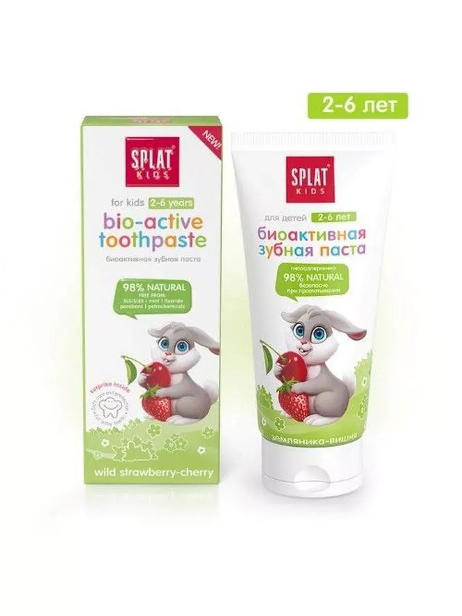 The SPLAT brand is a leading developer and manufacturer of professional solutions in the oral care categories. SPLAT KIDS TOOTHPASTE STRAWBERRY-CHERRY - Natural bioactive toothpaste for children from 2 to 6 years old. Appearance: • Consistency - pasty texture • Color - white Special features: DOES NOT CONTAIN: fluoride, parabens, SLES, triclosan, chlorhexidine, aggressive abrasives, synthetic colors and flavors, aluminum lactate, ethyl alcohol, synthetic glycols, PEG, peroxides, saccharin, GMOs, gluten, petroleum products. Protection from bacteria. The enzymes lactoferrin and lactoperoxidase together with extracts of licorice, Japanese honeysuckle and red grapes protect the oral cavity from bacteria. Healthy strong teeth and a surprise inside. Products of the series SPLAT KIDS helps children and their parents learn to brush their teeth in a fun, no-fuss way. Oral hygiene has never been so fun! An effective, natural, and safe children's toothpaste: - Total protection against cavities thanks to the innovative, patented LUCTATOL system. Clinically proven effectiveness. - Intensive enamel strengthening thanks to calcium hydroxyapatite (nHap). - Aloe Vera gel and L-Argenine care for healthy gums! 99.3% Natural. Safe when swallowed! Hypoallergenic. Result: Clinically proven after 4 weeks of use: Remineralizing effect - 34%, Antioxidant effect - 85%, Cleansing effect - 46%, Anti-inflammatory effect - 67%, Hemostatic effect - 61%, Fluoride-free.