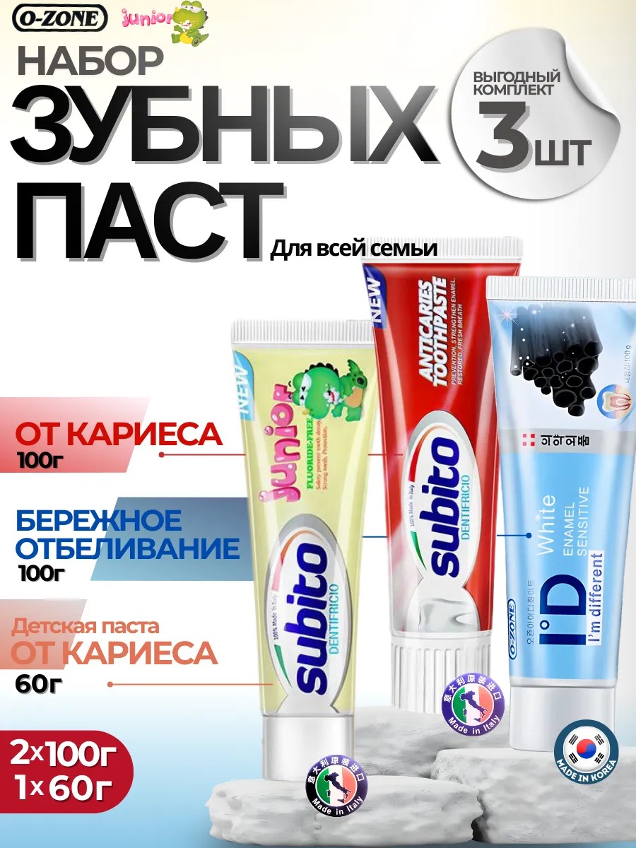 Набор зубных паст O-Zone Subito — это выгодный и практичный комплект из трёх тюбиков, идеально подходящий для всей семьи. В набор входят три разные пасты: от кариеса (100 г), бережное отбеливание (100 г) и детская паста от кариеса (60 г), что делает его универсальным решением для ежедневного ухода за полостью рта каждого члена семьи. Продукт сочетает в себе эффективность, безопасность и удобство использования, обеспечивая комплексную защиту зубов и десен. Паста от кариеса с фтором укрепляет эмаль, предотвращает развитие кариозных процессов и подходит как для взрослых, так и для детей старше 3 лет, особенно актуальна для тех, кто ищет зубную пасту от кариеса или пасту с фтором для профилактики. Бережная отбеливающая паста мягко удаляет налёты, придаёт зубам естественный блеск без повреждения эмали, что делает её отличным выбором для людей, стремящихся к свежему виду и здоровому цвету зубов. Детская паста Subito Junior с фторидом укрепляет зубы, защищает от кариеса и безопасна для чувствительной десны, подходит для детей от 3 лет.