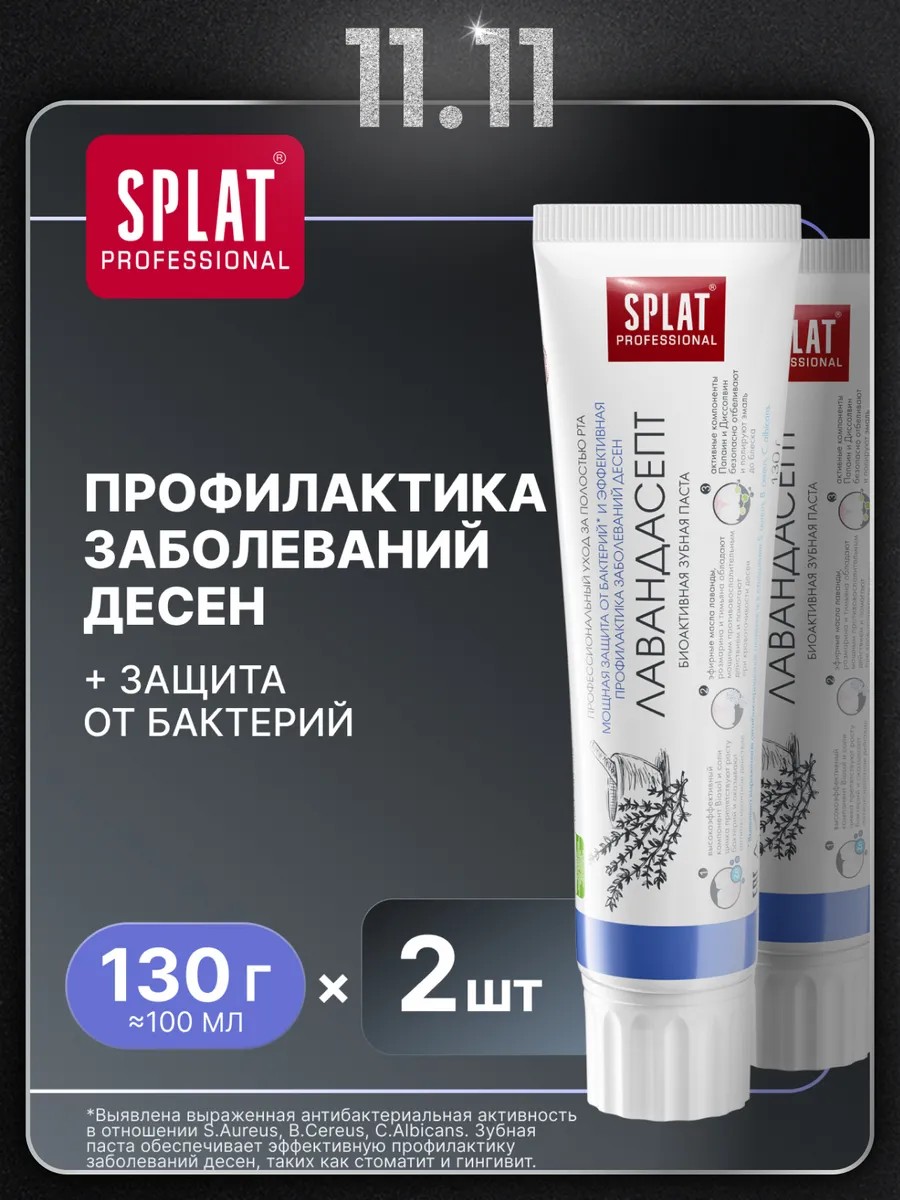 Профессиональная зубная паста SPLAT ЛАВАНДАСЕПТ без фтора для защиты от бактерий и профилактики заболевания десен, 100 мл, 2 шт. Зубная паста СПЛАТ Professional «Лавандасепт» (LAVENDERSEPT) с эфирными маслами лаванды, розмарина и тимьяна обладает мощным противовоспалительным действием, защищает от болезнетворных бактерий и станет отличным средством для гигиены и ухода за полостью рта. Помогает в профилактике кровоточивости десен, предупреждает стоматит и гингивит. Растительный фермент папаин бережно осветляет эмаль. Фосфат кальция помогает реминерализировать эмаль.