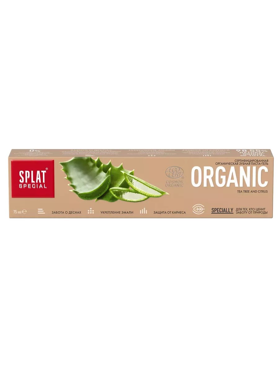 Splat, Зубная паста Organic, 75 мл., 1 шт. Зубная паста для укрепления эмали Special Organic российской компании Splatспециально разработана для очистки особо чувствительных зубов. За счет органического состава достигается эффект быстрого укрепления зубов и заживления десен. Средство выполняет очищающую, реминерализирующую, восстанавливающую функцию, способствует улучшению кровообращения и снятию признаков чрезмерной чувствительности. Алоэ вера в виде органического геля является мощным заживляющим средством. Кальцис из скорлупы яиц позволяет укрепить эмаль. Папаин расщепляет неприятный налет, отбеливая и полируя зубы. Масло чайного дерева, как мощнейший антибактериальный компонент, предотвращает кровоточивость десен и замедляет образование зубного налета. Хитозан оказывает ранозаживляющее и регенерирующее действие на мягкие ткани полости рта. Безопасный состав позволяет использовать пасту даже в период беременности и лактации. Способ применения: Антибактериальная зубная паста Splat Organic рекомендована для регулярного применения. Эффект очищения достигается за 30 секунд, но для оптимального результата рекомендуется чистить зубы в течение двух минут.