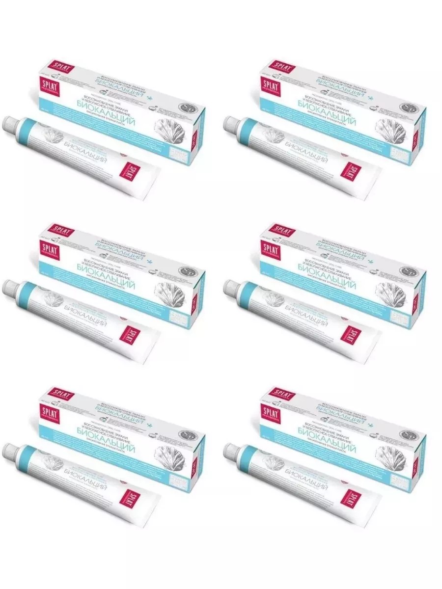 Splat, Зубная паста Professional Биокальций, 40 мл. В комплекте 6 штук по 40 мл. Зубная паста «Биокальций» разработана Splat Professional для восстановления эмали и снижения чувствительности зубов. Она насыщает зубы природным кальцием, укрепляя их и восстанавливая поврежденные участки. Гидроксиапатит действует идентично пломбе, «замуровывая» микротрещины на поверхности эмали. Натуральный фермент папаин в сочетании с компонентом Polydon препятствуют образованию налета и зубного камня. Инновационная система Sp.White System безопасно отбеливает зубы. Клинически доказанная эффективность за 4 недели применения: Реминерализующий эффект – 66,7%; Очищающий эффект – 61,4%; Десенситивный эффект – 55,3%; Отбеливающий эффект – 1,5 оттенка за четыре недели по шкале VITAPAN. Компактный тюбик (40 мл) удобно брать с собой в поездки.