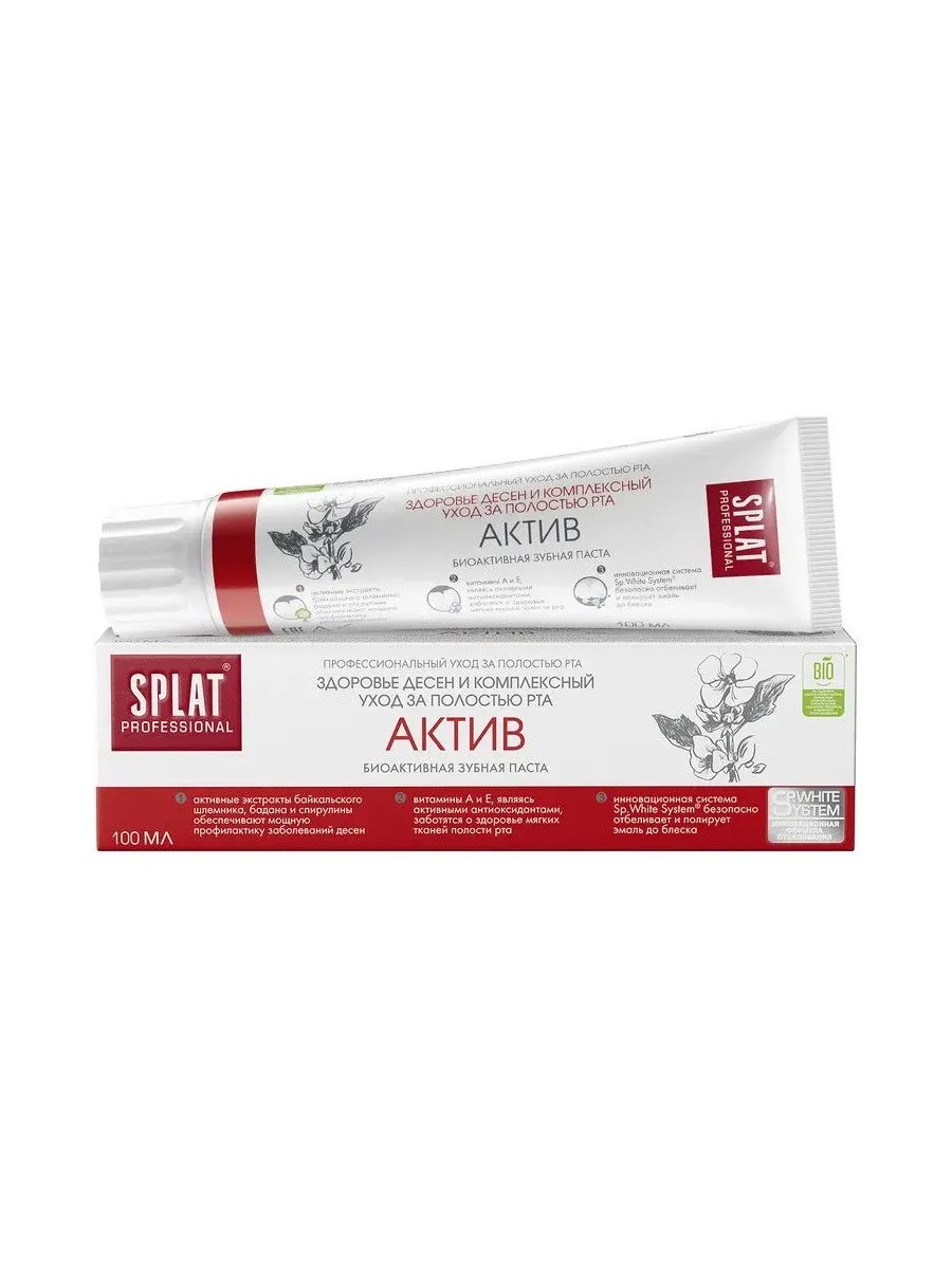 Зубная паста SPLAT Professional «Актив» (ACTIVE) комплексно ухаживает за зубами и чувствительными деснами, применяется для профилактики пародонтита. Экстракты байкальского шлемника, бадана и спирулины оказывают мощное противовоспалительное действие. Витамины А и Е способствуют заживлению мягких тканей полости рта. Глицерофосфат кальция укрепляет эмаль.Фторид-ионы эффективно защищают от кариеса. Отбеливающий комплекс Sp.White system бережно очищает и полирует эмаль до блеска.