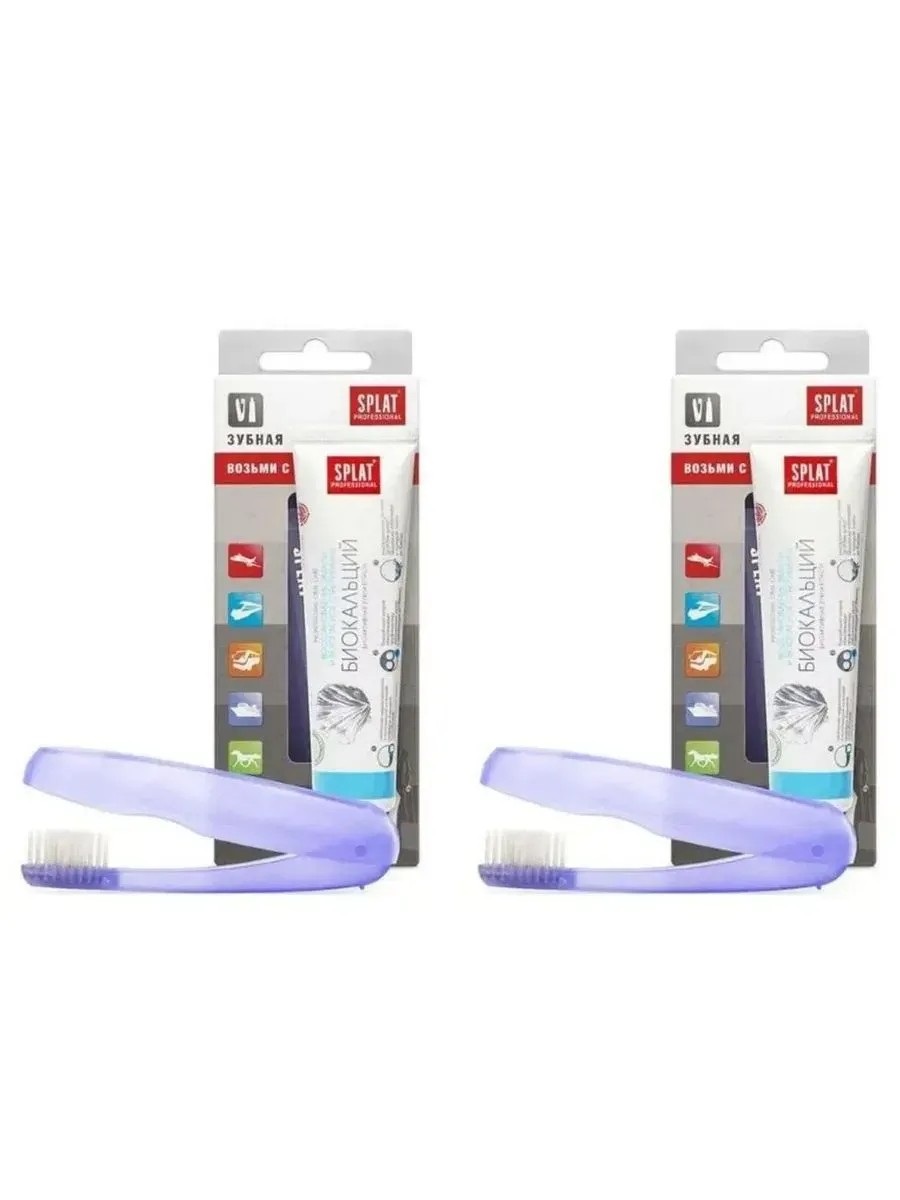 SPLAT PROFESSIONAL TRAVEL SET / BIOCALCIUM TOOTHPASTE 40ML + FOLDING TOOTHBRUSH / Brand SPLAT (Splat) is a leading developer and manufacturer of professional solutions in the oral care categories. SPLAT PROFESSIONAL TRAVEL SET BIOCALCIUM TOOTHPASTE 40ML + FOLDING TOOTHBRUSH - Cardboard packaging The travel set includes: a mini-package (40 ml) of SPLAT PROFESSIONAL BIOCALCIUM toothpaste and a folding toothbrush. Appearance and properties: Handle color and shape: different colors, rounded. Bristle color and hardness: white, medium Enamel restoration and safe whitening: Complex toothpaste with bioactive Calcis obtained from eggshells, and Hydroxyapatite - a building block of hard dental tissue. The paste is designed to restore enamel and reduce tooth sensitivity. Effect: The combination of hydroxyapatite and Calcis obtained from eggshells promotes enamel remineralization. Sodium bicarbonate normalizes the pH balance of the oral cavity and cares for gum health. The innovative Sp.White system safely whitens and polishes enamel to a shine. This travel toothbrush combines an attractive design and high ergonomics. It is easy to store: when folded, the bristles are covered by the lower part of the handle, which has ventilation holes. Thanks to this, the bristles do not get dirty or deformed in a bag or cosmetic bag. The bristles of the most popular travel brush are medium-hard with refined tips for the most effective and gentle cleaning of interdental spaces. Suitable even for sensitive teeth. Special features: Fluoride-free. Result: Clinically proven Proven: Remineralizing effect - 66.8%; Cleansing effect - 61.4%; Desensitizing effect - 55.4%; Whitening effect - 1.5 tones in four weeks according to the VITAPAN scale. Various color options, design ATTENTION!!! When ordering, it is not possible to choose a specific color. Before use, wash a new toothbrush in warm water with soap. You need to brush your teeth twice a day: morning and evening after