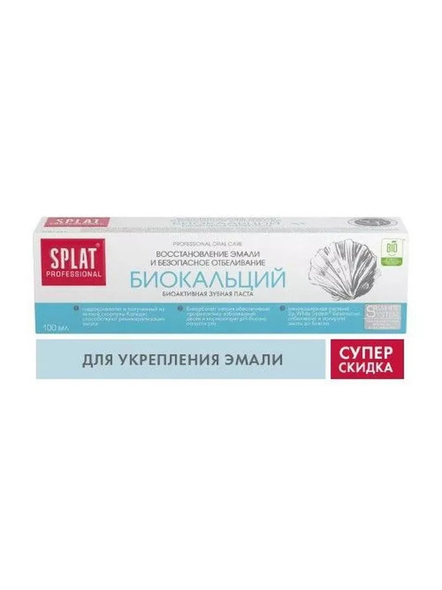 СПЛАТ PROFESSIONAL ЗУБНАЯ ПАСТА BIOCALCIUM 100МЛБренд SPLAT (Сплат) - ведущий разработчик и производитель профессиональных решений в категориях ухода за полостью рта.Линия PROFESSIONAL - серия средств для эффективного профессионального ухода за полостью рта в домашних условиях.SPLAT PROFESSIONAL ЗУБНАЯ ПАСТА БИОКАЛЬЦИЙКонсистенция - пастообразная текстура.Цвет - белыйСпециальные особенности: Без фтора.Усовершенствованные составы не содержат веществ, способных нанести вред человеку и экологии планеты: триклозан, хлоргексидин, мел, лактат аллюминия, пероксиды и нефтепродукты.В состав всех зубных паст SPLAT серии Professional входит система безопасного отбеливания SP.White System: округлые частицы диоксида кремния, фермент папаин, Полидон- комплексно очищают и осветляют эмаль зубов.Splat Professional Биокальций - это восстановление эмали и безопасное отбеливание.Восстановление эмали:Биоактивный Кальцис, полученный из яичной скорлупы, и гидроксиапатит - строительное вещество эмали для восстановления.Омега-3-жирные кислоты - источник витамина D3, способствуют лучшему усвоению кальция и минеральных веществ.Высокое содержание активных компонентов позволяет укрепить эмаль и снизить ее повышенную чувствительность уже после нескольких дней использования.Безопасное отбеливание:Сочетание натурального фермента папаина с Полидоном препятствует образованию налета и зубного камня.Комплексный уход:Паста нормализует pН-баланс полости рта и заботится о здоровье десен.Результат: Клинически доказано:Очищающий эффект - 55,8%.Кровеостанавливающий эффект - 60%.Реминерализующий эффект - 30%.Отбеливающий эффект - 1 тон за 4 недели.*после 4 недель применения.Без фтора.