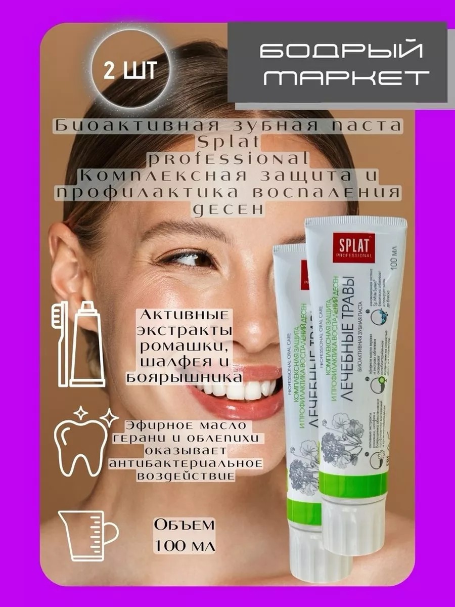 Set of 2. Natural Gel Toothpaste for Gum Inflammation, Medicinal Herbs, 100 ml. Dear customers! We present a unique toothpaste against gum inflammation and bleeding. Splat "Medicinal Herbs" toothpaste contains natural ingredients: calcis, obtained from eggshells, strengthens enamel and protects against cavities. This professional natural toothpaste contains geranium essential oil, which has pain-relieving properties and has a beneficial effect on emotional well-being. This medicated toothpaste is emerald in color. Our dental care kit contains sea buckthorn extract, which heals soft tissues. Ions strengthen tooth enamel and make it resistant to acids. It is important to maintain your oral health so that you only visit your dentist for preventive examinations. Start using this gel toothpaste in a tube for your oral cavity. It tones your gums and promotes healing and regeneration. This plaque-removing toothpaste is suitable for both adults and children. It also makes a great gift for loved ones. It's also perfect for traveling. Best of all, SPLAT, choose it and take care of your health!