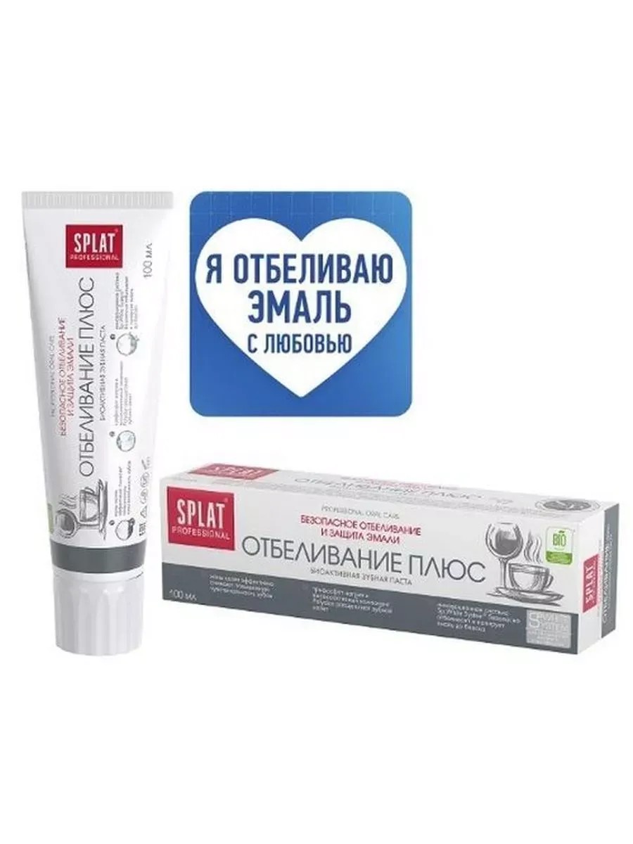 SPLAT PROFESSIONAL TOOTHPASTE WHITE PLUS 100ML Brand SPLAT (Splat) is a leading developer and manufacturer of professional solutions in the categories of oral care. SPLAT PROFESSIONAL TOOTHPASTE WHITENING PLUS Appearance: Consistency - pasty texture Color - white Special features: Contains sodium monofluorophosphate - 0.1% (1000 ppm). Improved formulations do not contain substances that can harm humans and the ecology of the planet: triclosan, chlorhexidine, chalk, aluminum lactate, peroxides and petroleum products. All SPLAT toothpastes of the Professional series include the safe whitening system SP.White System: rounded particles of silicon dioxide, the enzyme papain, Polydone - comprehensively clean and whiten tooth enamel. Effective complex toothpaste Whitening plus contains an innovative system for safe Sp.White whitening system, thanks to which teeth become 1.5 shades lighter in 4 weeks of use. Enamel protection: Potassium ions reduce increased tooth sensitivity. Complex action: Natural antibacterial components prevent plaque formation and provide fresh breath. Fluoride ions effectively protect against caries. Result: Clinically proven: Whitening effect - 1.5 shades in four weeks on the VITAPAN scale. Cleansing effect - 50%. Remineralizing effect - 40%. Hemostatic effect - 50.2%. *after 4 weeks of use. Contains fluoride - 0.1% (1000 ppm).