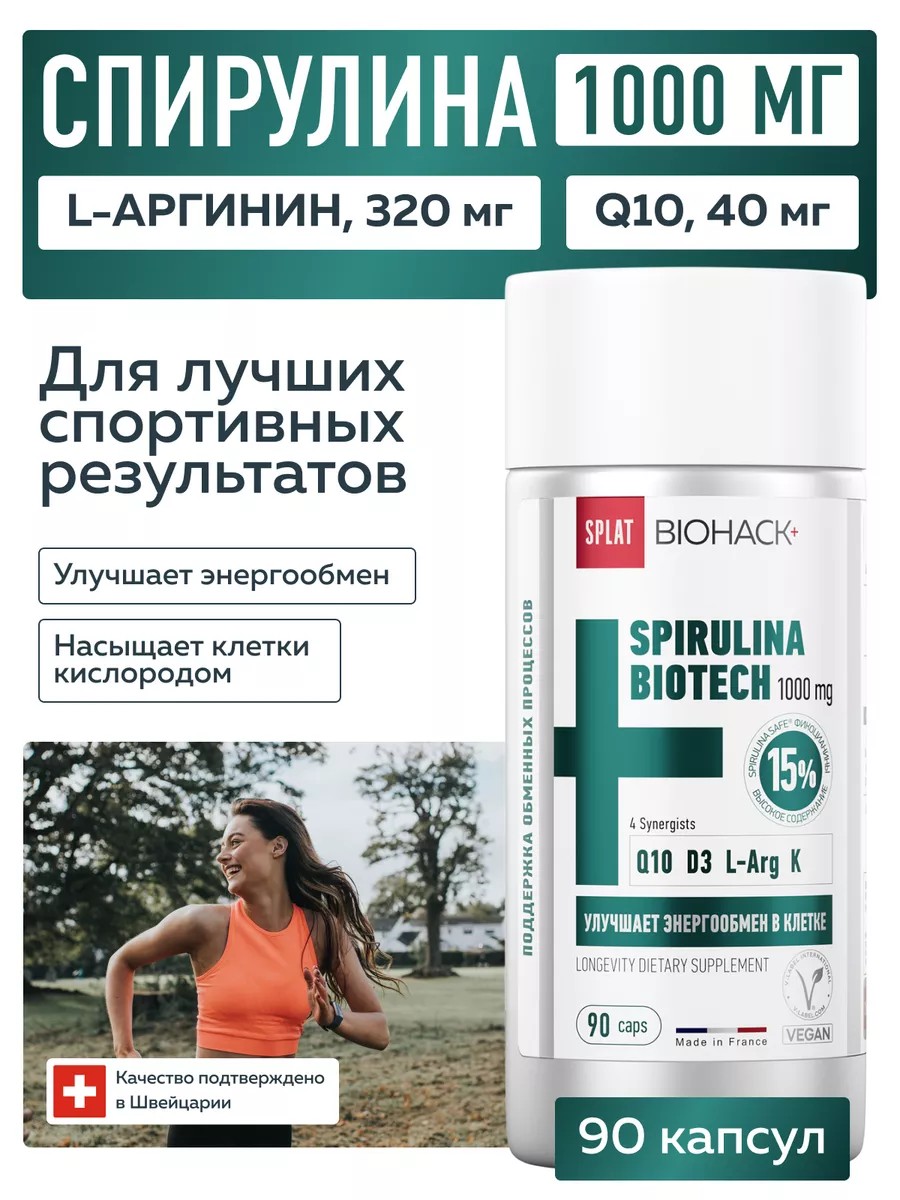 SPLAT BIOHACK+ SPIRULINA BIOTECH 1000 mg (4 capsules) contains: 1000 mg of Spirulina Safe microalgae – a source of 150 mg of phycocyanins + synergists: coenzyme Q10, vegan vitamin D3, L-arginine, potassium citrate. This dietary supplement improves energy production and cellular metabolism. Spirulina Safe contains a high content of phycocyanins – 15%. Phycocyanins are pigment-protein complexes; their high content increases nitric oxide levels, which are necessary for normalizing metabolism, heart function, and vascular health. Spirulina Safe's unique production technology preserves phycocyanins in a stable form and protects natural spirulina from the accumulation of xenobiotics from the environment. This weight loss supplement has been tested for microcystins. Vegetable capsule. HPMC capsule shell, does not contain titanium dioxide or artificial colors. Excipients: sunflower lecithin, acacia gum, gum arabic. This energy supplement does not contain: silicon dioxide, magnesium stearate, or MCC. Directions: Adults take 2 capsules twice daily with meals. Duration of use: 1 month. Repeat if necessary.