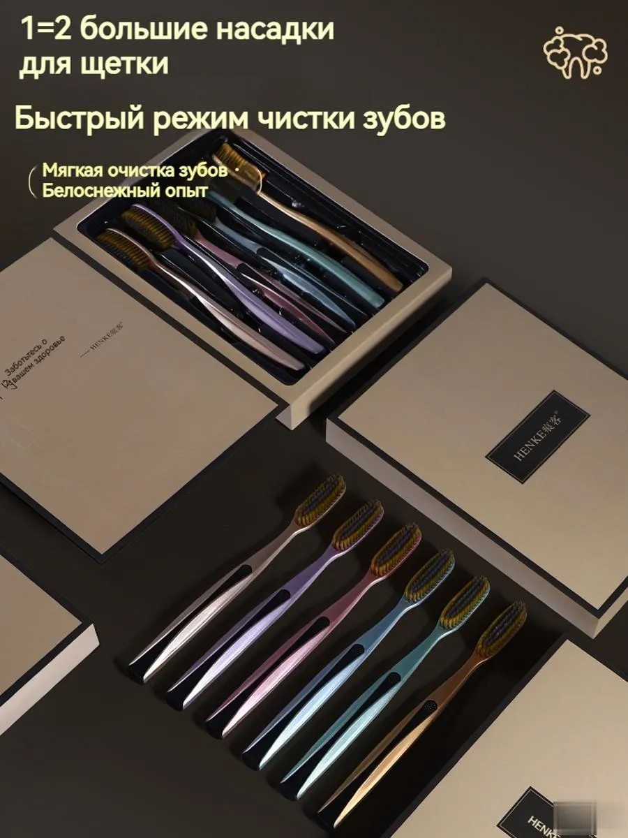 Этот набор зубных щеток сочетает в себе привлекательный вид и отличные свойства. Рукоятки выполнены в классических тонах, таких как черный, коричневый, кремовый, и украшены изысканными узорами в стиле бренда, что придает им лаконичный вид. Они выглядят как стильные небольшие предметы декора на умывальнике. Мягкие и густые щетинки нежно обвивают зубы, глубоко очищают промежутки между зубами и поверхности зубов, легко удаляют зубной налет, бережно ухаживают за деснами и при этом обеспечивают освежающий и чистоящий эффект при чистке зубов. Идеально подходит как для личного использования, чтобы удовлетворить потребность в ежедневной замене, так и для разделения с семьей и друзьями, придавая процедуре ухода за полостью рта особый ритуал.