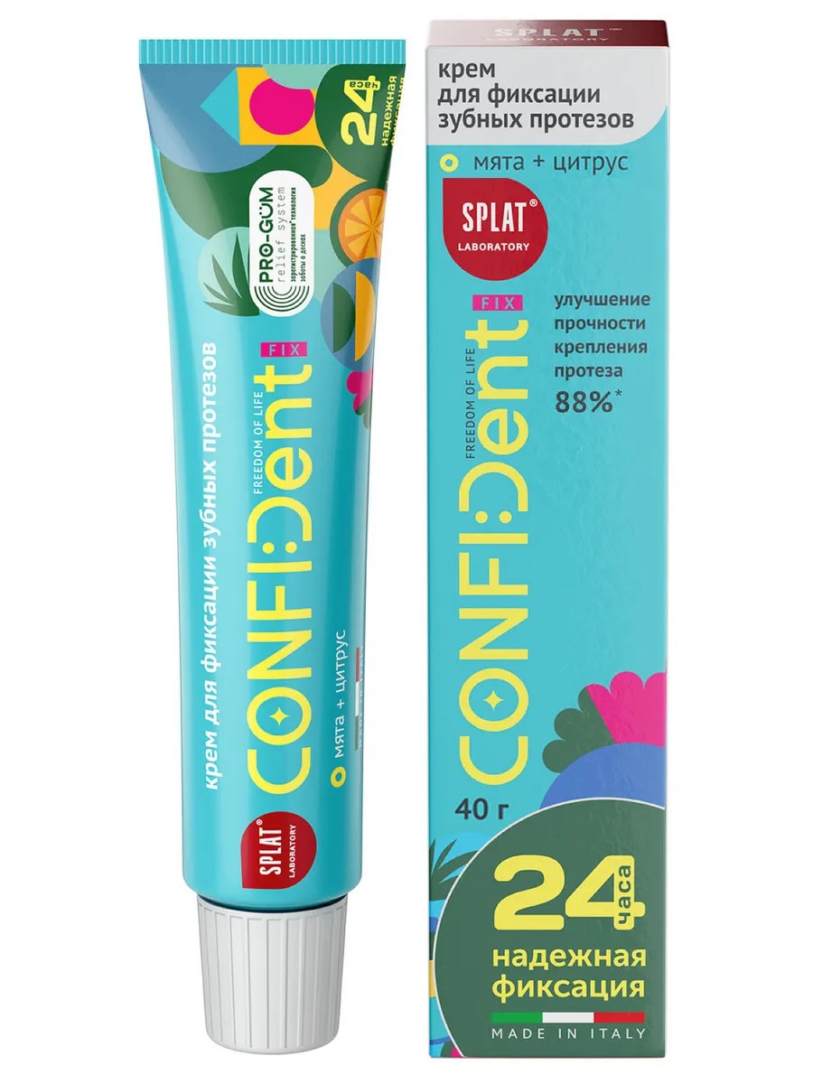 Надежная фиксация зубного протеза придаст вам уверенности и позволит заботиться о более важных вещах. Крем для фиксации зубных протезов Splat Confident Fix с приятным вкусом мяты и цитруса повышает качество жизни людей, использующих зубные протезы, предотвращает попадание частичек пищи под протез за счет всесторонней фиксации.