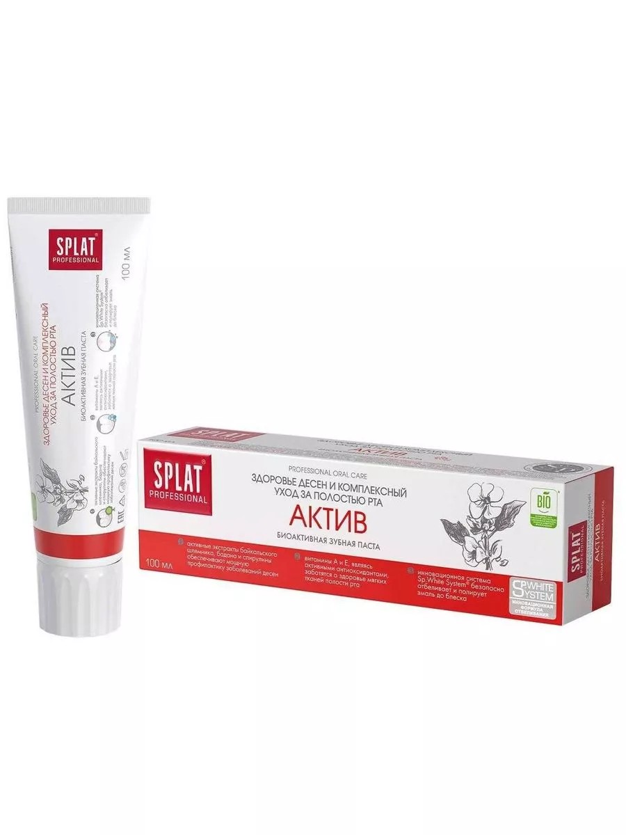 Splat Professional зубная паста "Актив" – это высокоэффективное средство для полного ухода за полостью рта. Объемом 100 мл, она обеспечивает длительное применение и дает ощутимые результаты.Основа этой зубной пасты – передовые технологии и инновационные компоненты, которые взаимодействуют, чтобы обеспечить идеальную гигиену и здоровье зубов и десен. Формула "Актив" разработана с учетом современных потребностей и требований, и она универсальна в применении.Состав пасты включает мощные антибактериальные и антикариесные компоненты, которые борются с возникновением кариеса и предотвращают образование зубного налета. Благодаря этому, зубная паста Splat Professional "Актив" обеспечивает надежную защиту от бактерий и восстанавливает эмаль, придавая зубам здоровый и блестящий вид.Кроме основного действия, паста также эффективно осветляет зубы, удаляя поверхностные пятна, вызванные кофе, чаем, красным вином и другими пигментированными продуктами. Это делает вашу улыбку более яркой и привлекательной.Для удобства применения, Splat Professional зубная паста "Актив" имеет удобную прочную упаковку объемом 100 мл, которая обеспечивает точное дозирование и экономичное использование продукта.Если вы ищете надежное и эффективное средство для своей устной гигиены, то Splat Professional зубная паста "Актив" – лучший выбор. Благодаря передовым технологиям и инновационным компонентам, она гарантирует полное уход за вашим здоровьем рта и придает вашей улыбке идеальный вид.