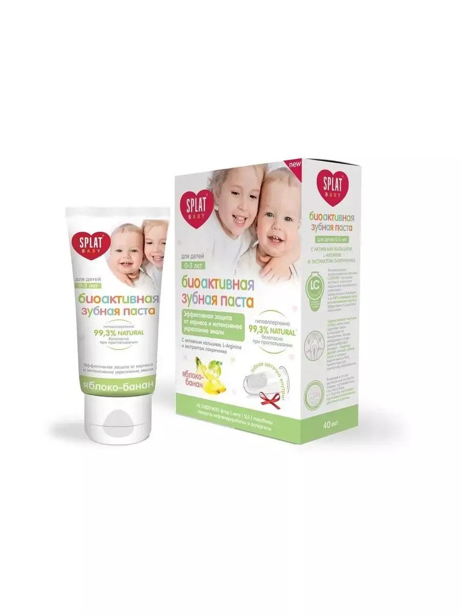 Splat Baby Apple-Banana Toothpaste for Children 0-3 Years, 40 ml + Fingertip Toothbrush. Splat Baby is an effective, 99.3% natural toothpaste that is safe to swallow. It provides total protection against cavities, intensively strengthens enamel, cares for gums, and reduces sensitivity during teething. Its effectiveness has been clinically proven. A unique, soft cleaning base similar to tooth enamel (dicalcium phosphate dihydrate) breaks down soft plaque and cleans children's enamel without damaging it. Licorice extract, part of the Luctatol complex, prevents its recurrence by 96%. This edible children's toothpaste is completely safe for children of all ages. The effectiveness of these products has been proven through extensive clinical trials, and the high efficacy of Luctatol has been proven in Japan. Patented. A silicone finger brush is included with the toothpaste.