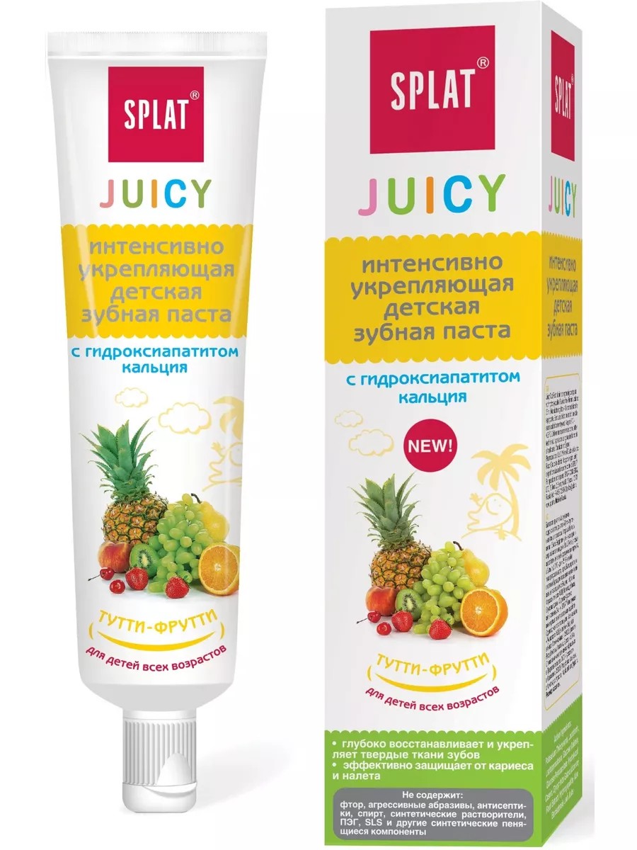 Детская зубная паста Splat «Juicy» специально разработана для детей всех возрастов.Паста глубоко восстанавливает и укрепляет твердые ткани зубов, эффективно защищает от кариеса и глубоко восстанавливает зубную эмаль. Гидроксиапатит кальция проникает глубоко в эмаль и делает ее плотнее и крепче, замуровывает ее повреждения подобно пломбе, делая поверхность более гладкой и устойчивой к воздействию бактерий и кислот.Натуральная, защищенная патентом система «Luctatol» эффективно ингибирует образование мягкого зубного налета и направленно уничтожает кариесогенные бактерии «Streptococcus mutans» .Гель Алоэ Вера обладает увлажняющими и противовоспалительными свойствами, успокаивает и заживляет десны. Не содержит: фтор, агрессивные абразивы, антисептики, спирт, синтетические растворители, ПЭГ, SLS и другие синтетические пенящиеся компоненты.