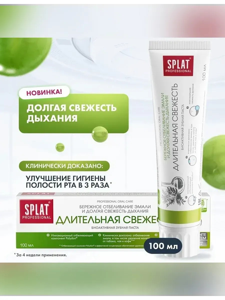 Splat Professional "Long-Lasting Freshness" toothpaste is the ideal oral care product that provides a long-lasting feeling of freshness. Contains natural extracts of mint and eucalyptus, giving the paste a pleasant taste and aroma. The soft texture of the paste does not irritate gums and is easy to apply to the toothbrush, ensuring even distribution over the surface of the teeth. The paste does not contain parabens and silicones, making it safe for oral health. It effectively protects teeth from caries and prevents the formation of plaque. Use Splat Professional toothpaste for daily care and enjoy fresh breath all day long. Suitable for adults, it provides reliable protection and care for teeth. Order Splat Professional "Long-Lasting Freshness" toothpaste now and feel the difference!