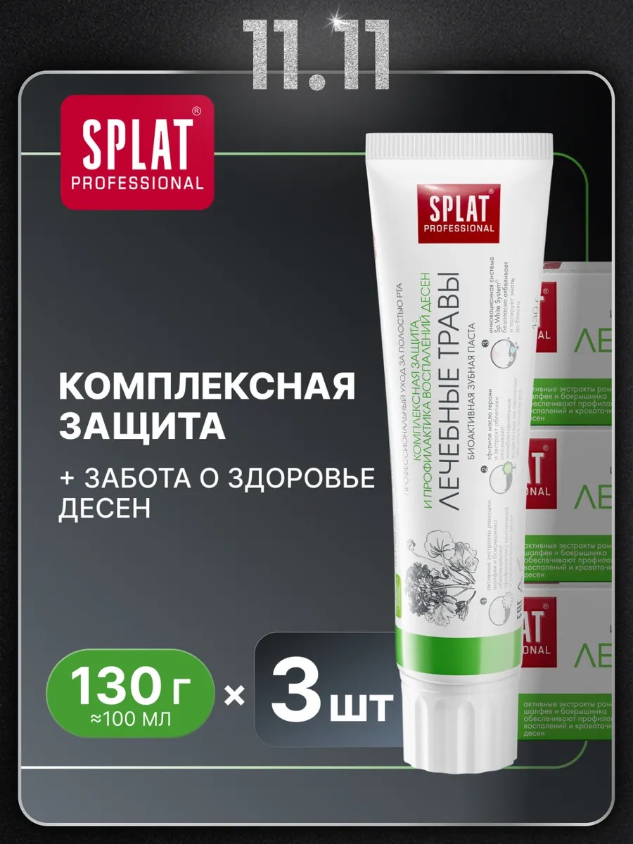 Гелевая зубная паста SPLAT Professional натуральная от воспаления десен Лечебные травы, 100 мл. Уважаемые покупатели! Представляем вам уникальную зубную пасту против воспаления десен и кровотечения. Профессиональная зубная паста сплат «Лечебные травы» содержит в своем составе натуральные компоненты: кальцис, полученный из яичной скорлупы, укрепляет эмаль и защищает от кариеса. Профессиональная натуральная паста содержит эфирное масло герани, которое обладает обезболивающим свойством и благоприятно влияет на эмоциональное состояние. Лечебная зубная паста изумрудного цвета подходит для ежедневной гигиены и ухода за полостью рта и зубами. Наш набор для ухода за зубами содержит экстракт облепихи, который заживляет мягкие ткани. Ионы укрепляют эмаль зубов и делают ее устойчивой к кислотам. Необходимо следить за здоровьем полости рта, чтобы бывать в кабинете у стоматолога только на профилактических осмотрах. Начните использовать гелевую пасту для чистки зубов в тубе для полости рта, она оказывает тонизирующее действие на десны, способствует улучшению процесса заживления и регенерации. Паста от налета подойдет для взрослых и детей с 14 лет. А также средство – отличный подарок для близких. Можно взять для путешествий. С уважением к Вам, SPLAT, выбирайте и берегите здоровье!
