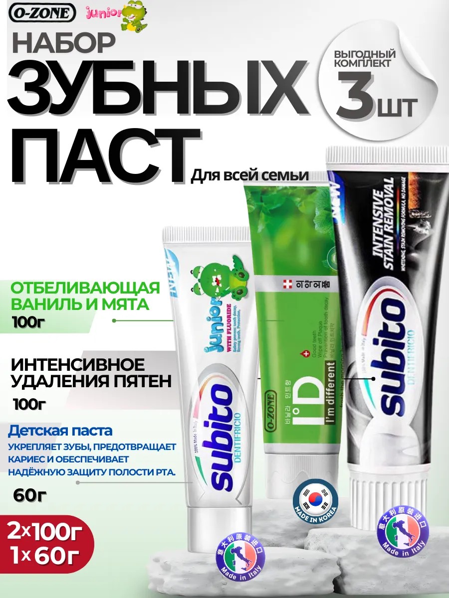 Все пасты из набора производятся по международным стандартам качества: детская паста и отбеливающая паста произведены в Италии, а паста для удаления пятен — в Корее, что гарантирует высокое качество и безопасность. Упаковка удобна для хранения и транспортировки, а наличие трёх разных формул позволяет выбрать оптимальный вариант для каждого члена семьи. Набор идеально подходит для домашнего использования, путешествий или в качестве подарка. Он подойдёт тем, кто ищет экономичный комплект зубных паст, набор для всей семьи, зубную пасту с фтором, отбеливающую пасту без агрессивных компонентов, пасту для чувствительных зубов, пасту для детей с фтором, пасту для удаления пятен и пасту для профилактики кариеса. Благодаря сочетанию эффективности, безопасности и доступной цены, этот набор стал популярным выбором среди покупателей, ценящих качественный уход за полостью рта.