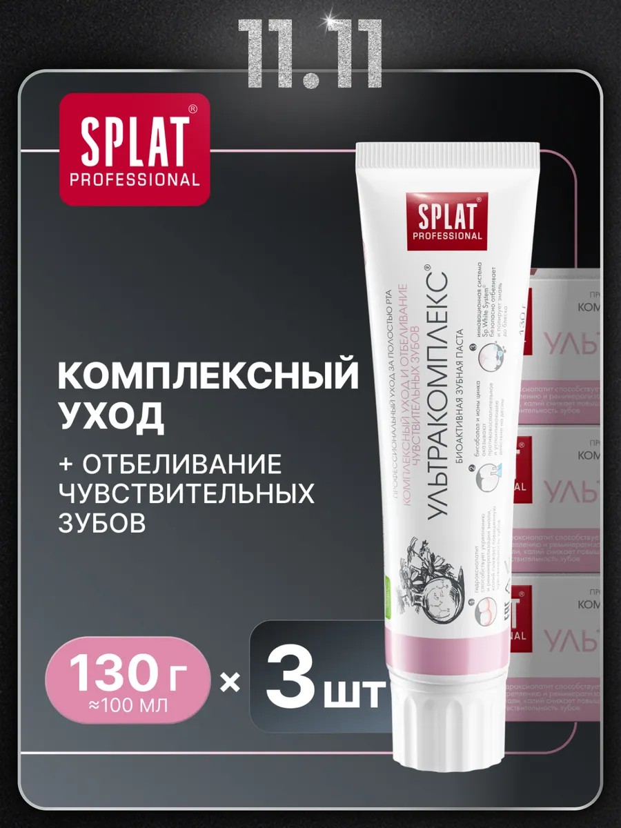 Профессиональная зубная паста для чувствительных зубов натуральная отбеливающая укрепляющая СПЛАТ Ультракомплекс. Ваши зубы чувствительны к холодному и горячему, и Вы испытываете дискомфорт? Мы поможем Вам справиться с этой деликатной проблемой! Зубная паста для чувствительных зубов от SPLAT Professional содержит органический кальций и лечебные компоненты, которые действенно укрепляют зубную эмаль, тем самым устраняя причину повышенной чувствительности зубов. Отбеливающая зубная паста с кальцием для отбеливания зубов обладает реминерализирующим, кровоостанавливающим и противовоспалительным эффектом. Клинически доказано, что зубная паста splat при регулярном использовании в течение 4 недель улучшает состояние зубов и десен. Зубная паста отбеливающая для комплексного ухода безопасно полирует эмаль благодаря инновационной системе Sp. White System, а натуральный компонент Polydon эффективно и деликатно расщепляет налет. Рекомендуется к применению взрослым, детям с 14 лет и при использовании систем исправления прикуса для брекетов для ежедневной гигиены и ухода за полостью рта и зубами. Позаботьтесь о здоровье полости рта, выбирая для себя и своих близких самое лучшее! С заботой о Вас, SPLAT.
