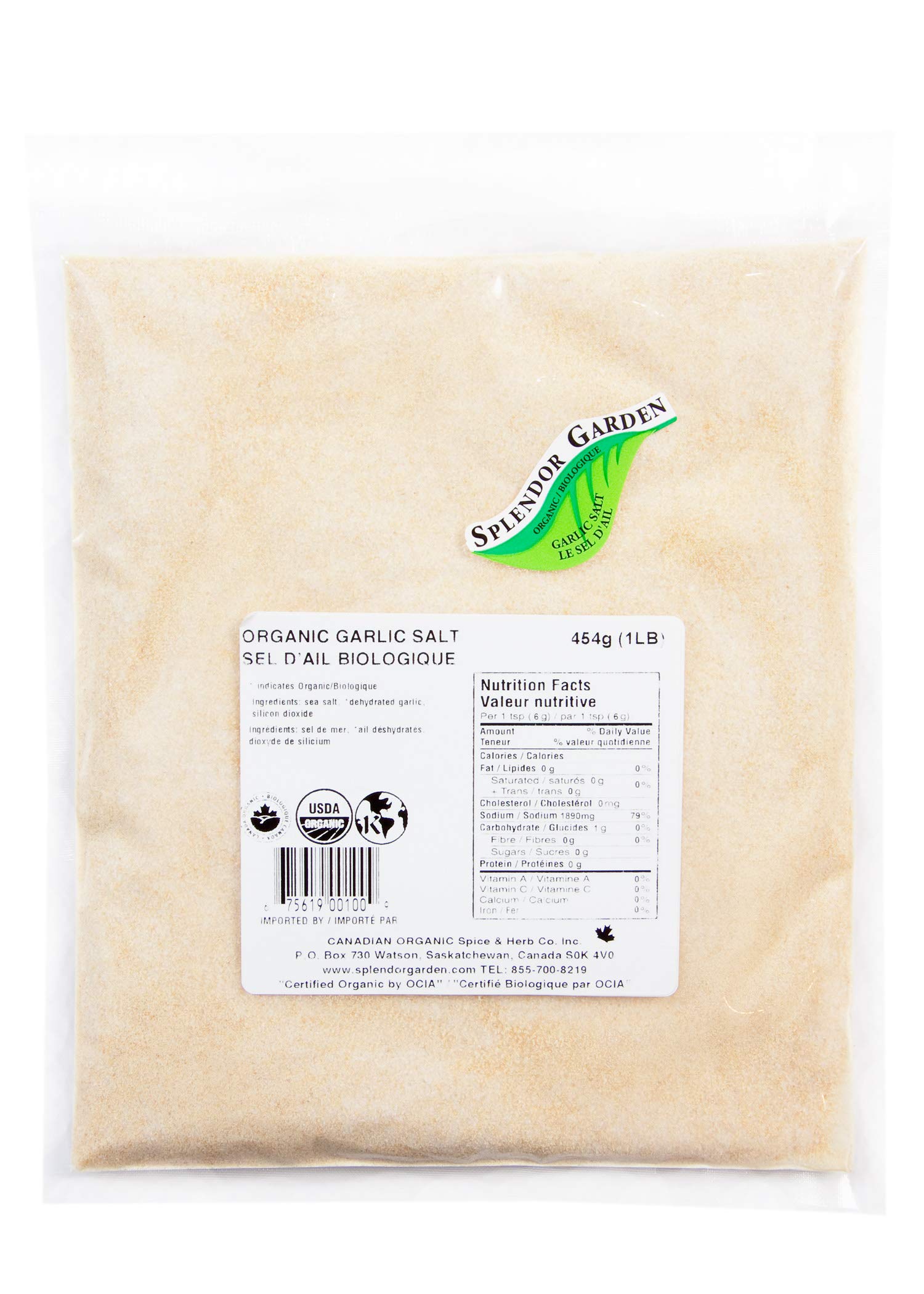 Garlic salt, the "go to" seasoning. Great for all of your cooking needs! Sprinkle onto scrambled eggs, into soups, in stews, or onto bread for easy garlic toast.GMO Free. Organic. Splendor Garden products contain only quality ingredients and are non-irradiated. A Canadian brand product. On every Splendor Garden brand package you will find a reusable label. Spices and herbs are gluten and nut free and the Splendor Garden brand products are packaged in a gluten and nut free facility. Certified Organic (Canadian Organic Regime USDA).