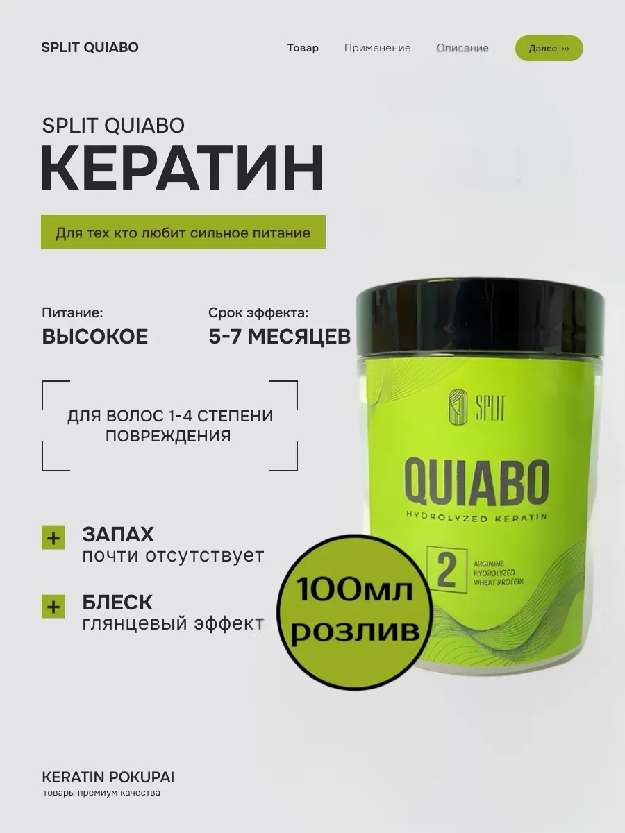 Процедура выпрямления волос split quiabo кератин с питанием обещает преобразовать волосы, делая их гладкими, блестящими и хорошо ухоженными. Это не просто процедура выпрямления, это комплексный уход за волосами, который укрепляет и восстанавливает волосы благодаря ингредиентам высокого качества. Основные характеристики продукта: Подходит для тонких и средних волос, как натуральных, так и окрашенных. Особенность этого кератина в его высокой силе выпрямления без утяжеления. Содержит гидролизованный коллаген, кератин и пшеничный белок для укрепления волос, а также аминопропилфенилтриметикон для дополнительной гладкости и блеска. Инструкции по применению: Подготовка волос: Начните с глубокого очищения волос специальным шампунем. Если у вас натуральные волосы, повторите процедуру 3-4 раза. В конце, оставьте шампунь на 5 минут и затем тщательно промойте. Подготовка к нанесению: Сушите волосы до полной сухости. Подготовьте продукт: Разделите волосы на 4 части и активно встряхните бутылку с кератином. Нанесение: Начните с нанесения продукта, отступая от корней, и убедитесь, что продукт равномерно распределен по всей длине. Оставьте на 20 минут. Сушка: С использованием фена на холодном режиме высушите волосы на 100%. Выпрямление: С помощью утюжка для волос с подходящим покрытием проходите по каждой пряди 10-15 раз. Регулируйте температуру в зависимости от типа и состояния волос. Завершение процедуры: Дайте волосам остыть, затем промойте без шампуня. Нанесите маску для глубокого восстановления, оставьте на 5 минут, а затем снова промойте волосы. Совет: Для наилучшего результата следуйте всем указаниям производителя. Если у вас есть сомнения или проблемы со здоровьем волос, рекомендуется проконсультироваться со специалистом перед процедурой.