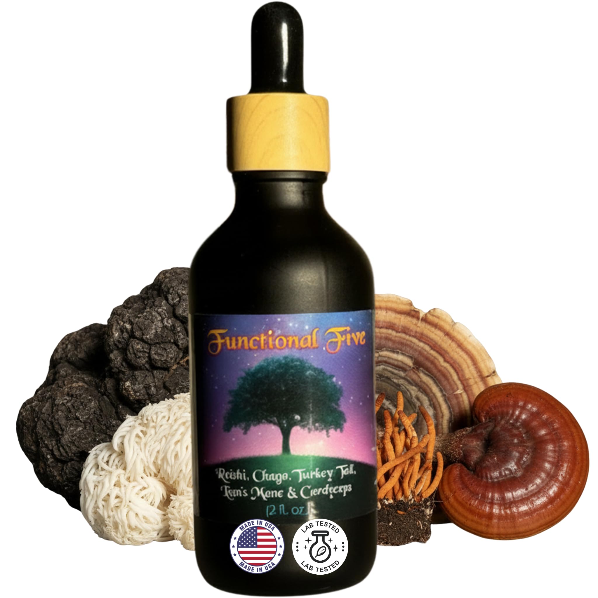Unlock the power of nature with our Functional Five mushroom extract (Lion's Mane, Reishi, Chaga, Turkey Tail Cordyceps). Crafted to deliver the highest quality and purity for your wellness routine. Perfectly suited for those seeking cognitive support, improved focus, endurance, gut support and overall vitality. How to Use Take 1-3 droppers (0.5-1.5ml) daily diluted in coffe, water, tea, juice or any liquid. Start with a lower dose and adjust based on your personal needs.Wellness Rooted in Nature: At Sporenity, we're passionate about harnessing the intelligence of real mushroom fruiting bodies to support modern wellbeing. Every batch is crafted with care, vegan, cruelty-free, recyclable, and tested for purity — because your brain and body deserve only the best nature has to offer. Easy Daily Use Made for Routine Wellness Take 1–3 droppers daily added into your favorite beverage. Bottled in a premium 2oz amber glass dropper for freshness and accurate dosing. These statements have not been evaluated by the FDA. Lab Certified Triple Filtered Third-party tested for quality and purity, then triple filtered for a smooth, clean taste with consistent potency in every drop. Supports Immune, Brain, Stress Energy Balance Formulated to support immune system function, cognitive clarity, stress resilience, oxygen utilization, and natural energy production—without stimulants or fillers. Double Extracted for Maximum Potency Alcohol and water extraction methods are used to capture beta-glucans, triterpenes, and other naturally occurring compounds from each mushroom. Five Mushroom Full-Spectrum Blend Combines Chaga, Cordyceps, Lion's Mane, Reishi, and Turkey Tail into one thoughtfully crafted liquid extract designed to support daily wellness, balance, and vitality.