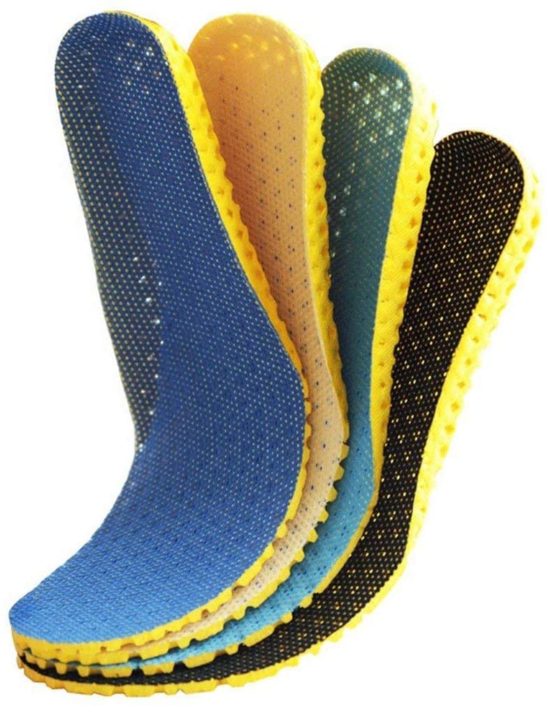 Color : as shown 1 . The insoles were made by velent fabric and silicone , those will make the insoles very lissom , flexible and comfortable . 2 . They are breathble and wicking , make your feet feel dry and comfortable . 3 . We design the cushion in the heel , damping and reduced pressure . It can massage your feet , alleviate foot fatigue . Color : Black , Yellow , Blue , Dark Blue Size35 / 36 / 37 / 38 / 39 / 40 / 41 / 42 / 43 / 44 / 45 / 46