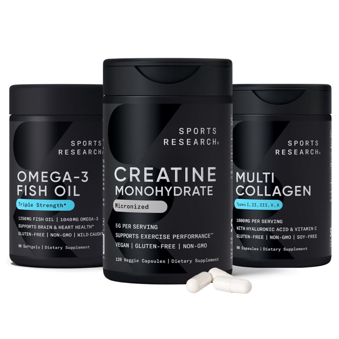 Just 1 Capsule a Day: Just one (1) of our pescatarian-friendly fish oil liquid softgels contain a minimum of 1,040mg of essential Omega-3 fatty acids with 690mg of EPA 310mg of DHA in the preferred triglyceride molecular form. PERFORMANCE RECOVERY SUPPORT : Incorporating Creatine Capsules into your supplement and wellness routine ensures that you have enough of this strength and performance-enhancing amino acid, which is fundamental to building protein, in your muscles. . 5 Types of Collagen Contains Type I, II, III, V, X Collagen Hyaluronic Acid Vitamin C for Skin, Bone Joint Health. Always Fresh, Never Fishy: We strive to deliver exceptional quality - that means a fish oil supplement without the aftertaste or fish burps that often follow low-quality fish oil capsules. Our Omega-3 oil is extracted, with minimal heat exposure, through a 10-step refinement process that removes fishy odors and impurities. OUR CREATINE, YOUR PERSONAL BEST: Optimize your workout routine with Sports Research Creatine Monohydrate capsules, which, when combined with regular exercise and taken daily, can help you stay sharp and build lean muscle in just four capsules. For faster results, a loading period may help. .
