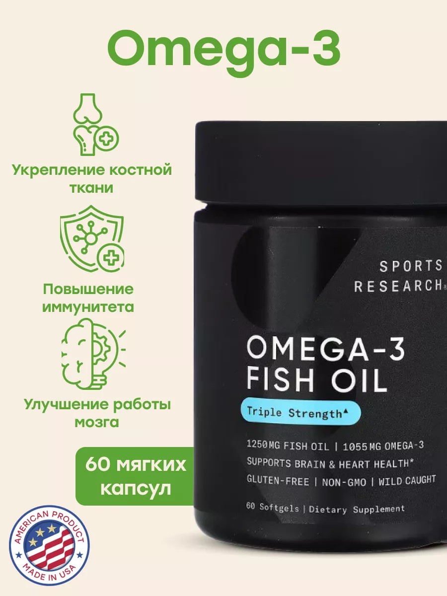 Омега 3 Премиум 90% концентрат 1330 мг ЭПК и ДГК в капсуле (более 1000 мг в капсуле) - это группа жирных кислот омега3 ПНЖК (ЭПК и ДГК), организм не способен вырабатывать их самостоятельно. Омега 3 1000 мг - это БАД для роста и развития, для нервной системы, для мозга, для сердца и сосудов, для иммунитета, для здоровья волос и кожи. Витамины тройная Омега 3 от 1000 мг - капсулы содержат рыбий жир из дикой рыбы. Упаковки Omega 3 90 капсул хватит на 3 месяца приема. 1 капсула Омега-3 в день. Комплекс витаминов подойдет для взрослых, женщин, мужчин как для ежедневного приема, так и для спорта. Особенно дозировку Омега-3 1000 мг в капсуле и более любят спортсмены. Мужчинам, которые подвергают свой организм интенсивным физическим нагрузкам, Омега 3 позволяют усилить эффект тренировок, уменьшить боль в мышцах, ассоциированную с образованием молочной кислоты, быстрее нарастить мышечную массу. У них улучшается текучесть крови, быстрее сжигаются жиры, снижается масса тела, уходит «пивной» живот. В крови уменьшается концентрация «плохого» холестерина. Улучшается работа пищеварительной системы. Женщинам Омега-3 необходима для нормальной работы сердца, сосудов, печени, женских репродуктивных органов. Принимают полиненасыщенные жирные кислоты ПНЖК Омега-3 женщины, которые стремятся сохранить молодость и красоту кожи. Полезны Омега-3 для волос, придают волосам блеск, предотвращают выпадение. При регулярном приёме Омега-3 снижает уровень холестерина, очищает сосуды, нормализует работу щитовидной железы, сердца. Повышается сопротивляемость клеток повреждающим факторам, замедляется старение организма. Клетки органов быстрее восстанавливаются, что способствует сохранению молодости. В коже удерживается влага, благодаря чему она не становится сухой, не шелушится, разглаживаются морщины. Для снижения веса - недостаток Омега-3 может замедлить снижение веса. Омега-3 жирные кислоты— это вещества, которые не вырабатываются в человеческом организме, а значит должны регулярно поступать в него с пищей. Наиболее важными Омега-3 жирными кислотами являются эйкозапентаеновая кислота (ЭПК) и докозагексаеновая кислота (ДГК). При их недостатке замедляется обмен веществ, снижается мышечная масса и увеличивается объем жировой ткани в организме. Признаки дефицита омега 3 рыбный жир: раздраженная кожа, депрессия, боли в суставах.