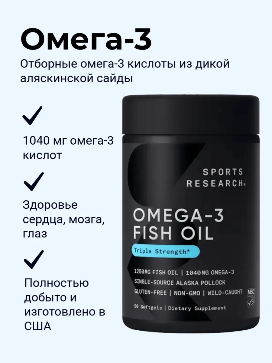 Рыбий жир с омега-3 от Sports Research содержит сверхконцентрированные уровни ЭПК и ДГК (937 мг) в каждой капсуле из рыбьего желатина. Добывается из дикой аляскинской сайды, обитающей в холодных водах (а не из рыбы, выращенной на фермах).