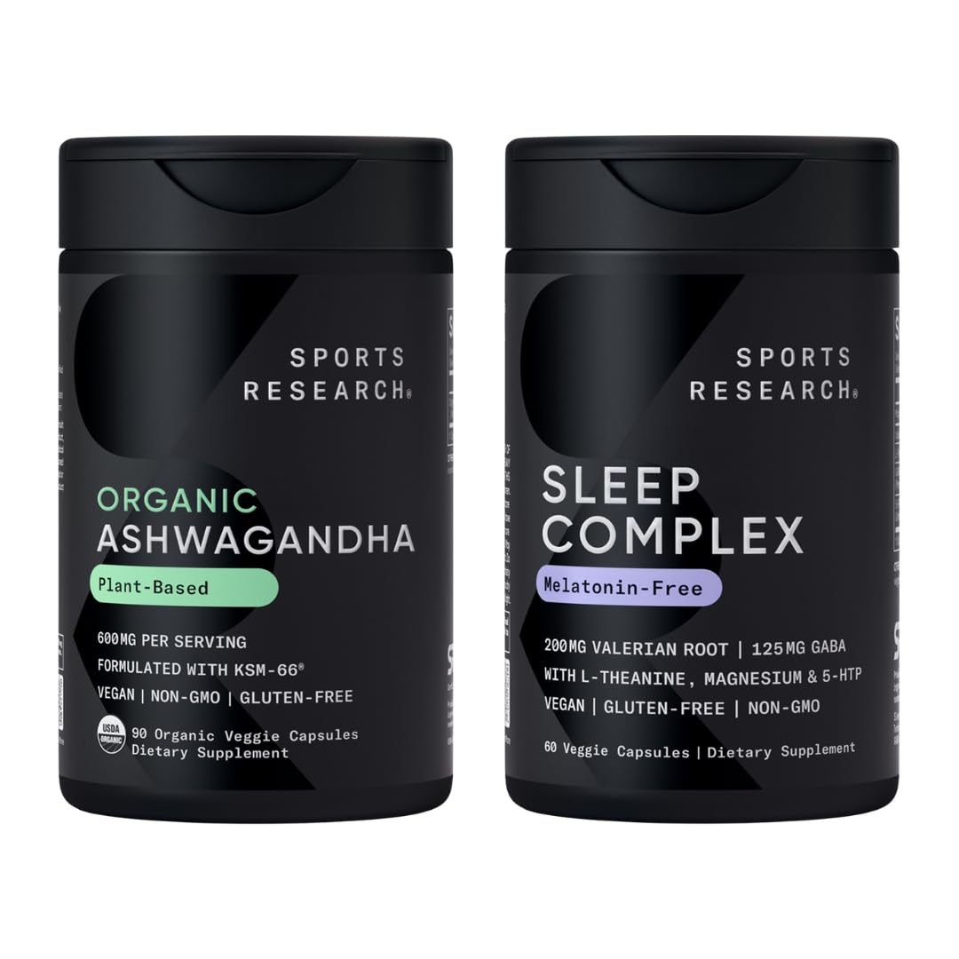 Sports Research Sleep Pack - Organic Ashwagandha Adaptogen for Relaxation Calm & Sleep Support 600 mg + Sleep Complex- Melatonin-Free Vegan Capsules