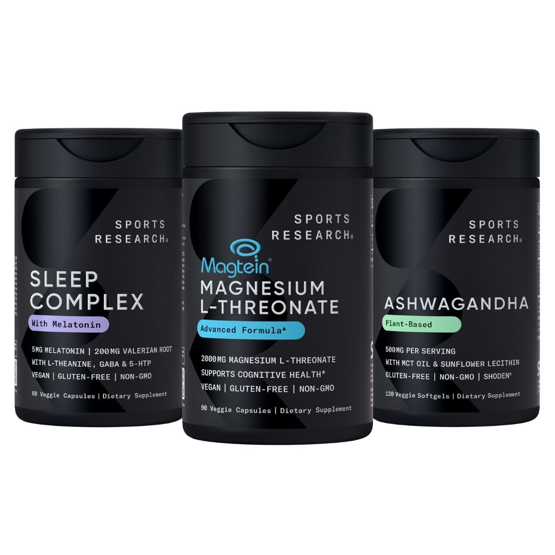 Ashwagandha-The Adaptogen: Sports Research Ashwagandha is made with Shoden, the most advanced extract on the market, offering an industry-leading 35 withanolide content. Shoden is sustainably harvested from the roots and leaves (where more of the good stuff is) of the plant on farms in India using a fully traceable process to uphold purity standards. MADE WITH MAGTEIN: Magtein is a patented compound called threonic acid developed by a group of MIT researchers. Magtein is the only form that effectively crosses the blood-brain barrier and increases magnesium levels in the brain, which is critical for improving cognitive function. Our easy-to-swallow Magtein magnesium L-threonate veggie capsules are the easiest, most convenient way to add this essential mineral to your daily diet. HIGHLY BIOAVAILABLE FORM: Magnesium L-threonate is the salt formed from mixing magnesium and threonic acid, a water-soluble substance derived from the metabolic breakdown of vitamin C. Easily absorbed, our magnesium L threonate capsules are used for their overall brain health benefits and may help support memory, focus, relaxation, mood, and cognition. 6-IN-1 FORMULA: Each serving contains a synergistic blend of three types of Magnesium, Valerian Root standardized to 2 Valerenic Acid, 200 mg of L-Theanine, 125 mg of Gamma-Aminobutyric Acid, and 100 mg of 5-HTP for comprehensive sleep support, now included with 5 mg of Melatonin. . MELATONIN SLEEP SUPPORT : Our classic Sleep Complex formula now includes 5 mg of Melatonin, aiding with a deeper and more restful sleep so that you can get the sleep quality you need to help you take on the day. .