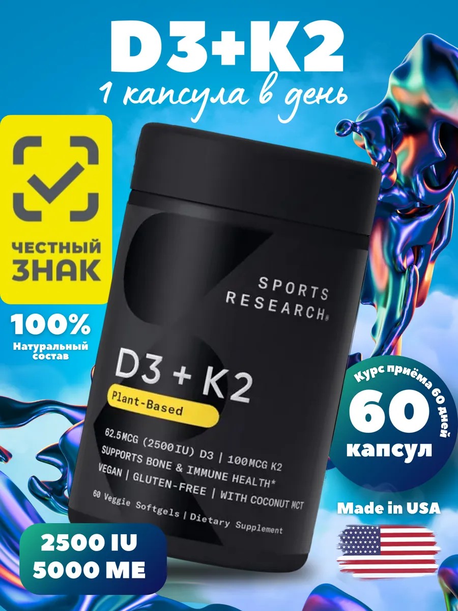 Sports Research Витамин D3 + K2 - это комплексный витаминный препарат, разработанный для поддержания здоровья костей, сердечно-сосудистой системы и обмена веществ. Каждая капсула содержит оптимальное сочетание витамина D 3 и витамина К2, которые дополняют и усиливают друг друга, обеспечивая максимальную эффективность и быстрое усвоение в организме. Витамин D3 улучшает усвоение кальция, необходимого для роста и поддержания здоровья костей, а также укрепляет иммунитет и помогает в борьбе с воспалительными процессами. Витамин К2, в свою очередь, содействует правильному распределению кальция в организме, предотвращает его отложение в мягких тканях и сосудах, что способствует нормальной работе сердечно-сосудистой системы.