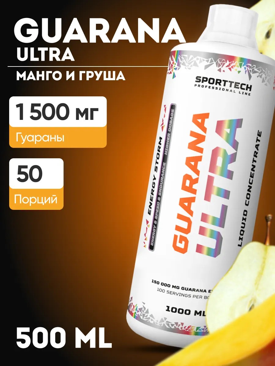 GUARANA ULTRA ОТ SPORTTECH 500 мл. Концентрат безалкогольного напитка с высоким содержанием Гуараны . Стимулирует расщепление жировой ткани, незаменим при низкокалорийных диетах для сохранения энергетического потенциала организма. Снижает аппетит, мощный жиросжигатель. Воздействуя на центральную нервную систему, используется для улучшения концентрации внимания, а так же для увеличения мощности мышечных сокращений. Не раздражает слизистую оболочку желудка, так как в качестве основного источника Кофеина используется натуральный, растительный экстракт гуараны. В малом объеме воды содержится высокая концентрация активных веществ. Экстракт гуараны также улучшает концентрацию внимания и подходит для людей, которые заняты умственным трудом, водителей, студентов, ученых и спортсменов во время подготовки к соревнованиям или тренировок. Энергетический напиток является отличной альтернативой кофе. После приема спортпит повышается давление, учащается пульс, а кровь устремляется к скелетным мышцам. Повышая обмен веществ, гуарана напиток выступает как эффективный жиросжигатель. Установлено, что добавка спортпит еще и снижает аппетит, возможно, за счет оттока крови от органов пищеварения и повышения уровня глюкозы в крови. Спортивный энергетик гуарана - средство, которое помогает уменьшить усталость и мышечную боль после интенсивных тренировок, что позволяет быстрее восстанавливаться