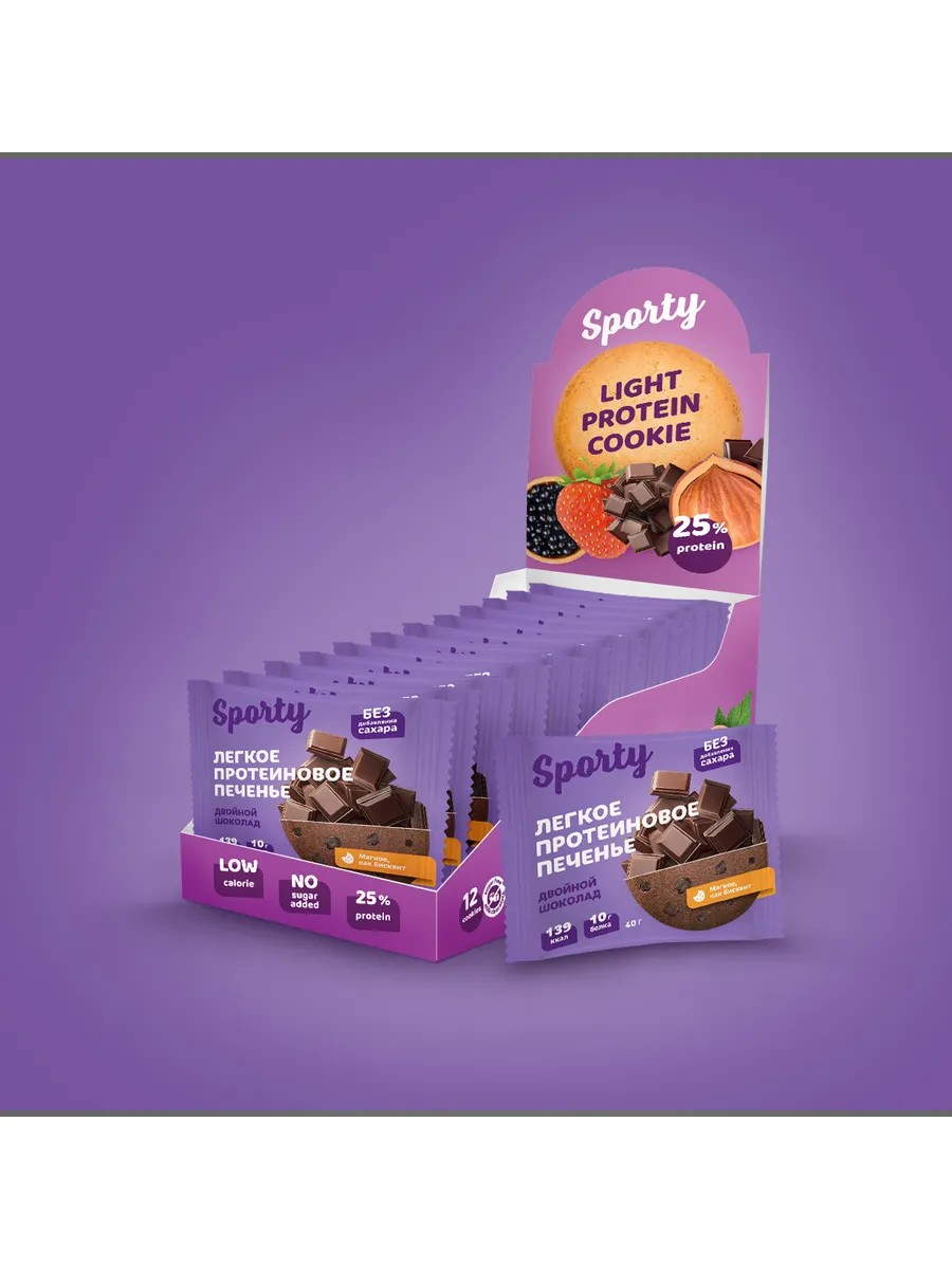«Двойной шоколад» – это хит продаж от Sporty. Вкус "Двойной шоколад" придёт в боксе фиолетового цвета из-под ассорти. Протеиновое печенье, которое ты не отличишь от шоколадного брауни. Только в нём есть 10 г белка, всего 139 калорий и нет сахара (ни в основе, ни в уникальном шоколаде). Если ПП-печенье, то Sporty!