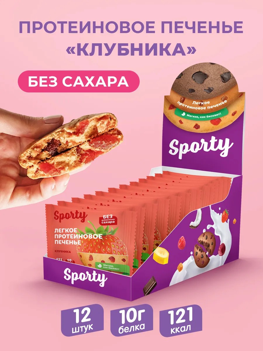 Sporty Protein Light «Клубника» – спортивное питание с 25% белка. Оно нежное, с кусочками клубники, насыщенным вкусом и консистенцией мягкого бисквита. Печенье Sporty не отличить от домашней выпечки, при этом его калорийность меньше, чем, в среднем, у протеиновых батончиков. Каждый бокс с полезными сладостями надежно упакован и защищен термопленкой. Мы используем для печенья уникальный молочный шоколад без сахара, сладкие пп цукаты и натуральный сывороточный протеин. Мы поставляем только свежее печенье с собственного производства. Печенье без сахара подойдет для низкокалорийных перекусов на работе, в спорт зале, на фитнесе, на прогулке, в дороге; когда хочется вкусной диетической еды на похудении; для тех, кто любит продукты без сахара. Наш белковый десерт - это идеальный подарок, ведь у него яркая подарочная упаковка и коробка, которую оценят и зож ники, и любители спортивного питания и просто люди, которые любят мягкую выпечку. Мы используем натуральные ароматизаторы и безопасные сахарозаменители и подсластители: стевия, инулин, сукралоза. Алкализированный какао в наших питательных фитнес печеньях очень ярко передает вкус шоколадки с кусочками фундука, вишни, банана, клубники, ягод и т.д. Спортсмены составляют пищевые рационы с нашими пп сладостями для спортивной фигуры. Ведь калорийность наших cookies бисквитов низкая. В каждой протеиновой печеньки содержится ~7г клетчатки. Пищевая ценность: сывороточный белок 10г, жиры 4,7г, углеводы 6,2г. Рекомендуем попробовать наши другие ассорти, если вы любитель клубники, соленая карамели, кокоса, двойного шоколада, а также печенья в шоколаде и протеиновых батончиков.