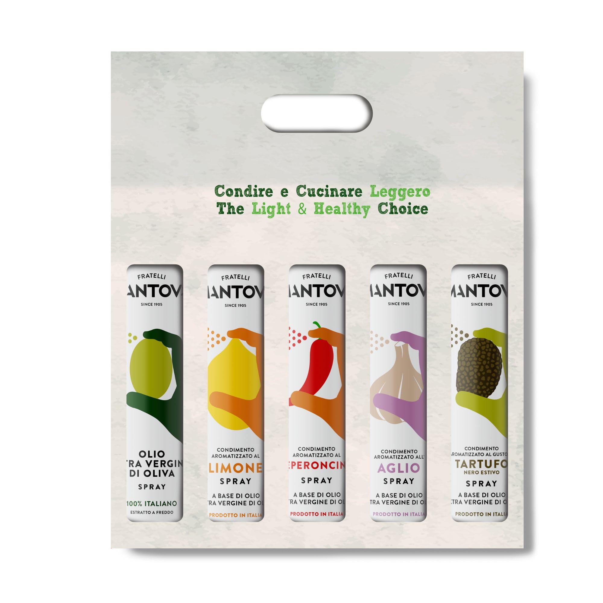 This set contains 5 bottles: extra virgin olive oil flavored with garlic, lemon, chili pepper, and black truffle. 100 Italian virgin olive oil, cold-pressed fruity taste with bitter and spicy aromas featuring notes of green olives and fresh herbs. This oil has a distinctive, balanced, and harmonious taste. The intense, sharp taste of garlic meets the cold-pressed olive oil extracted from Mantua to create an excellent and pleasant oil with delicate spices and soothing properties. The fresh, citrusy notes of Sicilian lemons blend with the fruity notes of the cold-pressed virgin olive oil, creating a symphony of taste and aroma. Characterized by its typically sharp and intense flavor, chili pepper is a spice with countless benefits. Seasoning spray with black truffle made with extra virgin cold-pressed olive oil – with natural black truffle flavoring and extract (Tuber Aestivum Vit.). The strong, characteristic taste of the truffle, combined with the balanced and harmonious flavor of the native extra virgin olive oil, creates a spice with an intense and long-lasting aroma. Thanks to the bag valve, the leggero spray saves up to 90 of oil. A 250 ml bottle is therefore equivalent to approximately 3 liters of traditionally measured liquid oil. Furthermore, the contents are protected from air and light for an extended period. This preserves all the valuable properties of the oil, keeping it as fresh as possible. Each second spray delivers 1.8 ml or 1.7 g (15 kcal) of olive oil – enough to enhance any dish. INSTRUCTIONS FOR USE Use for cooking and seasoning. Use sparingly to conserve oil. Store in a cool, dry place, away from direct sunlight and heat sources. Suitable for various diets, but consider any specific dietary restrictions.SPRAYLEGGERO Lot de 5 x 250 ml : huile d'olive Natives Extra et arôme avec ail, citron, piment, truffe noire.DESCRIPTION DU PRODUIT DESCRIPTION DU PRODUIT Ce lot contient 5 bouteilles : huile d'olive vierge extra et aromatisée avec ail, citron, piment, truffe noire. 100 huile d'olive vierge italienne, pressée à froid goût fruité avec des arômes amers et épicés aux notes d'olive vertes et d'herbes fraîches. Cette huile a un goût distinctif, équilibré et harmonieux. Le goût intense et tranchant de l'ail rencontre avec l'huile d'olive pressée à froid extraite de Mantua, pour créer une huile excellente et agréable avec des épices fines et des propriétés apaisantes. Les notes fraîches et agrumes des citrons siciliens se mêlent aux notes fruitées de l'huile d'olive vierge pressée à froid et créent une symphonie de goût et d'arôme. Caractérisé par le plaisir typiquement aiguisé et intense, le piment est une épices avec des milliers d'avantages. Spray à assaisonnement avec truffe noire à base d'huile d'olive pressée à froid extra – avec arômes et extrait naturel de truffe noire (Tuber Aestivum Vit). Le goût fort et caractéristique du champignon, combiné au goût équilibré et harmonieux de l'huile d'olive extra native, permet de créer une épices avec un arôme intense et durable. Grâce à la valve de sac, le spray leggero permet d'économiser jusqu'à 90 d'huile. Une bouteille de 250 ml correspond donc à environ 3 litres d'huile liquide traditionnellement dosée. En outre, le contenu est protégé longtemps de l'air et de la lumière. Ainsi, toutes les propriétés précieuses de l'huile restent inchangées et elle reste comme fraîche. Chaque seconde pulvérisation fournit 1,8 ml ou 1,7 g (15 kcal) d'huile d'olive – suffisante pour affiner chaque plat. MODE D'EMPLOI Utiliser pour cuisiner et assaisonner. Utiliser de manière contrôlée pour économiser sur l'huile. Conserver dans un endroit frais et sec, à l'abri de la lumière directe du soleil et des sources de chaleur. Convient pour différents régimes, mais envisagez d'éventuelles restrictions diététiques spécifiques.